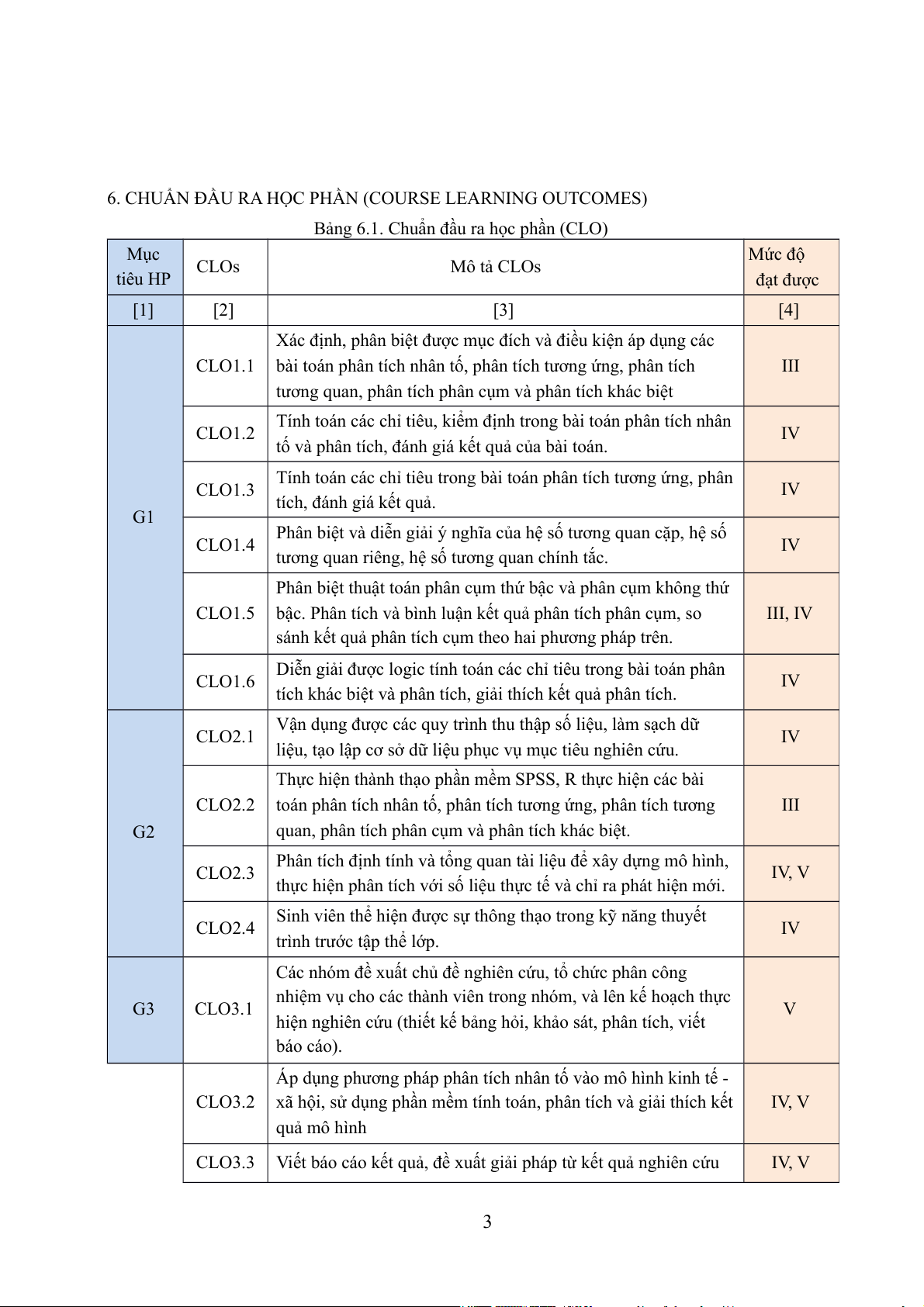 Bảng 6.1. Chuẩn đầu ra học phần (CLO) Mục Mức độ CLOs Mô tả CLOs tiêu HP đạt được [1] [2] [3] [4]