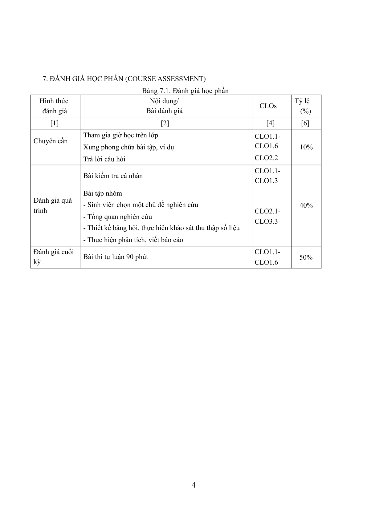 Bảng 7.1. Đánh giá học phần Hình thức Nội dung/ Tỷ lệ CLOs đánh giá Bài đánh giá (%) [1] [2] [4] [6]