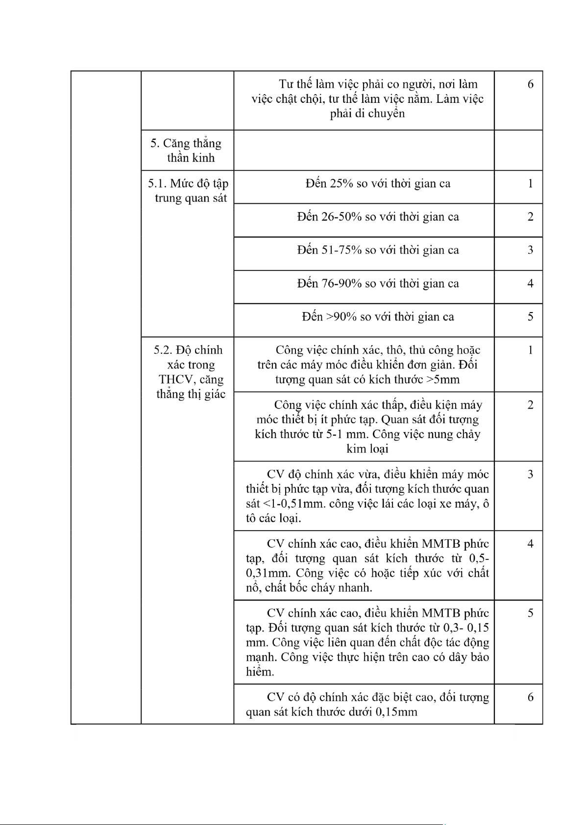 41-50kg, thời gian thực hiện chiếm >50% 7 thời gian ca 2. Mức đơn Trên 100 giây 1 điệu của công việc 30-100 giây 2 20-29 giây 3 10-19 giây 4 9-5 giây 5 1-4 giây 6 3. Nhịp độ làm thao tác/h 1 việc 361-720 thao tác/h 2 721-900 thao tác/h 3 901-1500 thao tác/h 4 15000 thao tác/h 5 4. Tư thế làm Tư thế thuận lợi 1 việc