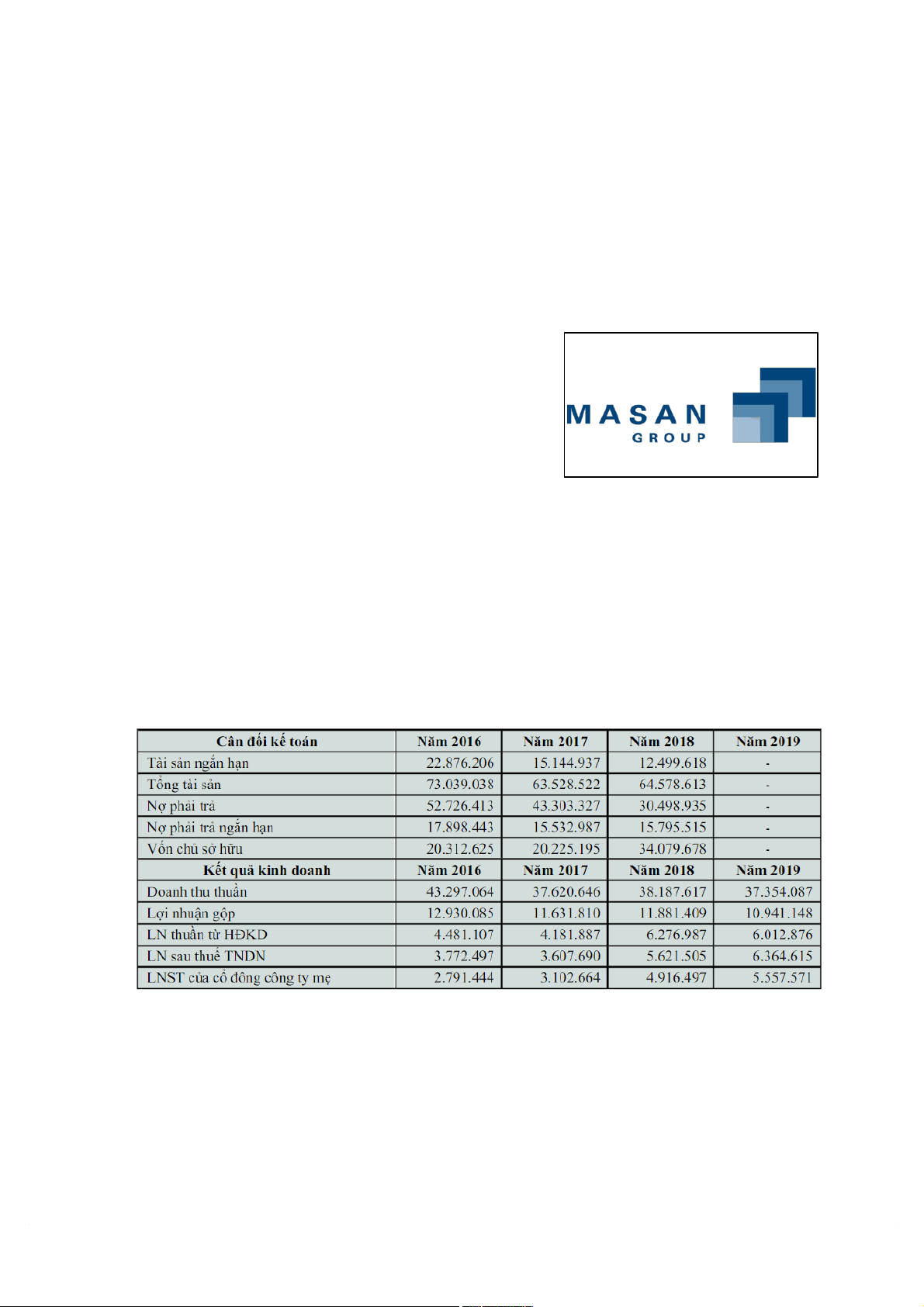 tuy vậy lại ảnh hưởng rõ rệt trên bảng cân đối kế toán của CTCP Tập đoàn Masan năm 2019. 17 Năm 2018 Năm 2019 Tổng tài sản 64.578.613 97.297.251 Tài sản ngắn hạn 12.499.618 24.261.892 Tài sản dài hạn 52.078.995 73.035.359 Nợ phải trả 30.498.935 45.408.844 Nợ ngắn hạn 15.795.515 30.492.191 Nợ dài hạn 14.703.420 14.916.653 Vốn chủ sở hữu 34.079.678 51.888.407