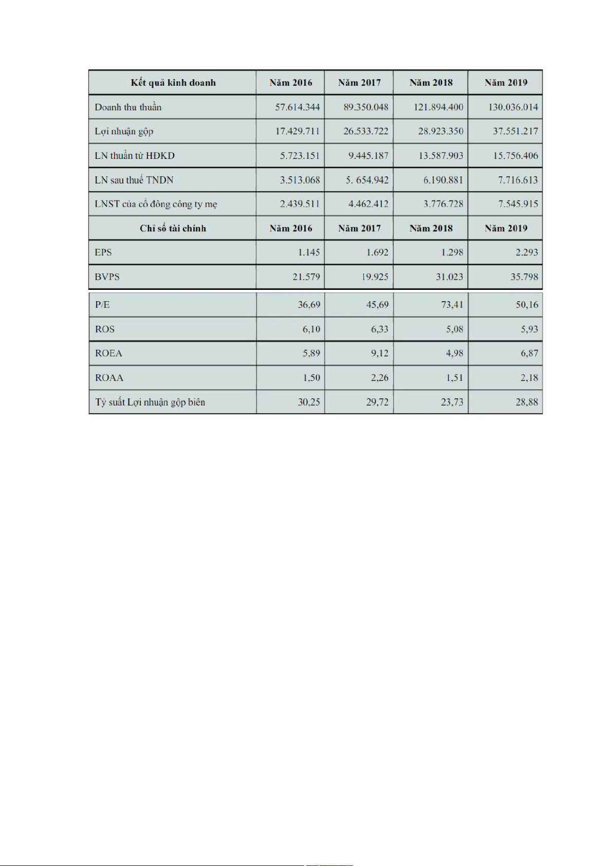 đáng kể khi xem xét các chỉ số tài chính theo năm từ 2018 đến 2020. Chỉ số tài chính 2018 2019 2020 EPS 4.558 4.765 1.054 BVPS 29.299 44.389 21.308 P/E 17 11,86 84,37 ROS 14,72 17,04 1,81 ROEA 18,11 12,93 3,21 ROAA 7,68 6,87 1,16 18