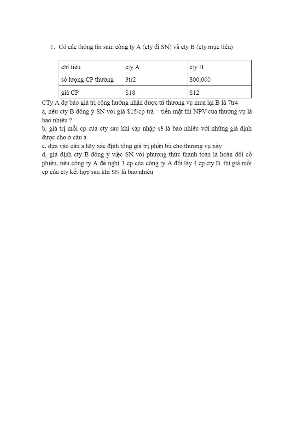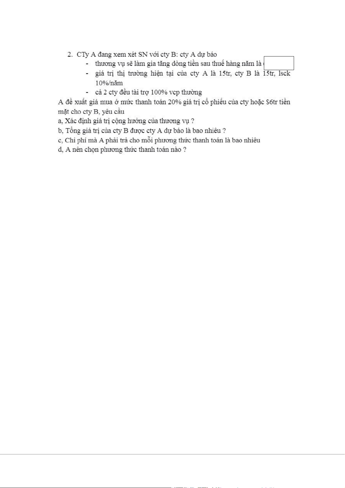 - với phương thức thanh toán bằng cổ phiếu 20%*(15tr+7tr6)=4tr520 d. NPV= 7tr6-6tr= 1tr6