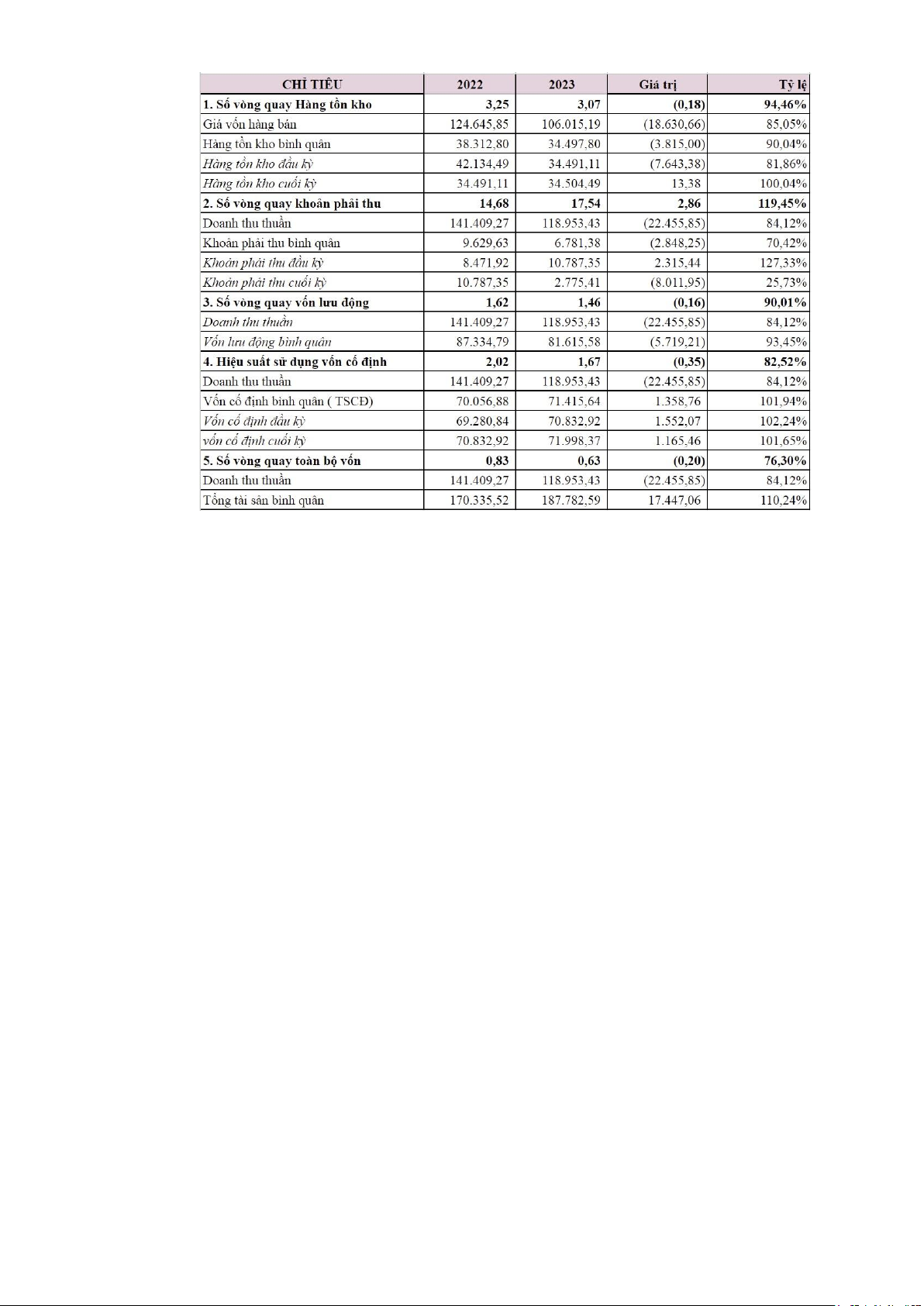 Hiệu suất sử dụng vốn cố định của công ty năm 2022 là 2,03 vòng. Năm 2023 là