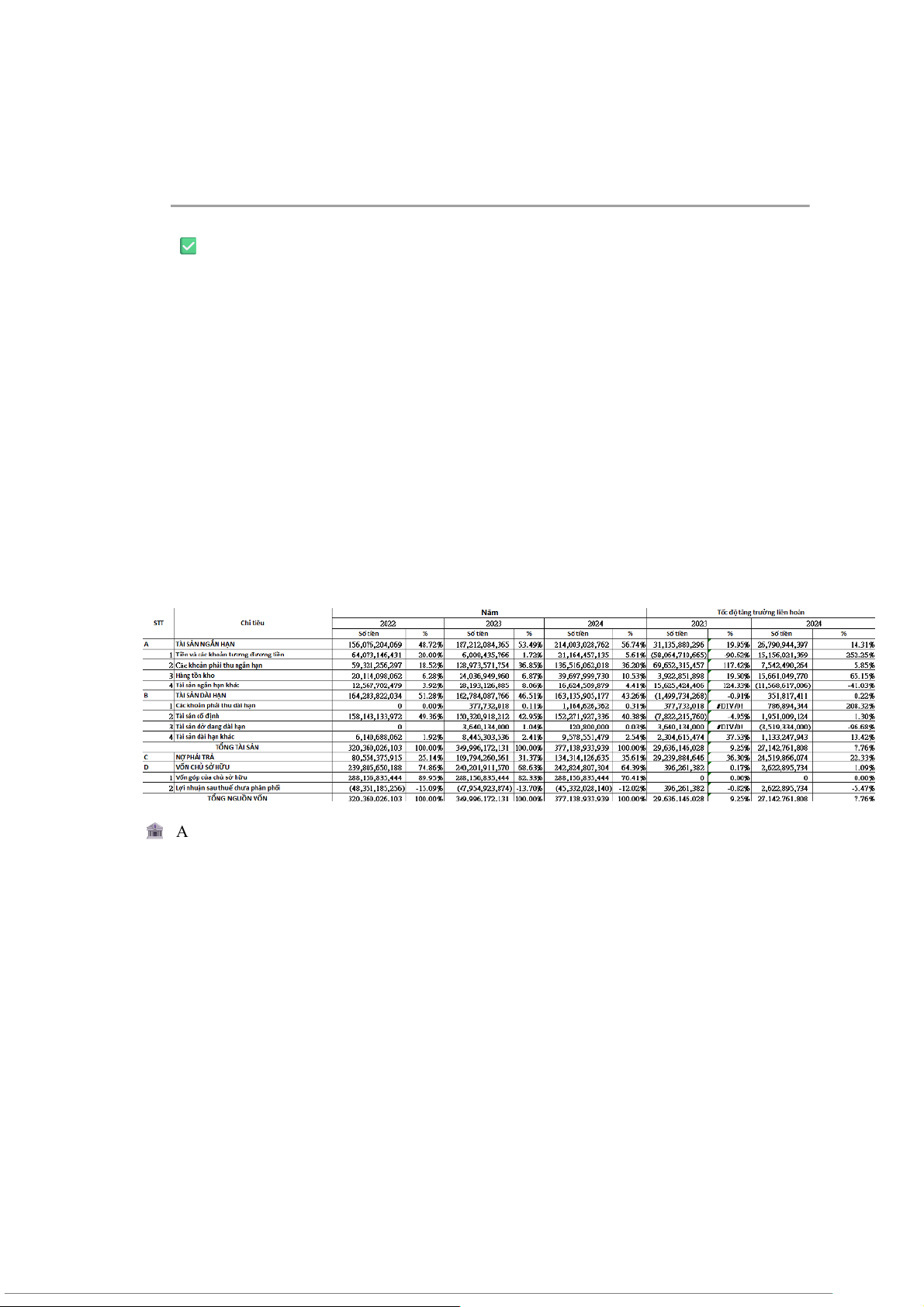 Bảng cân đối kế toán giai đoạn 2022–2024 cho thấy doanh nghiệp đang trong quá trình tái