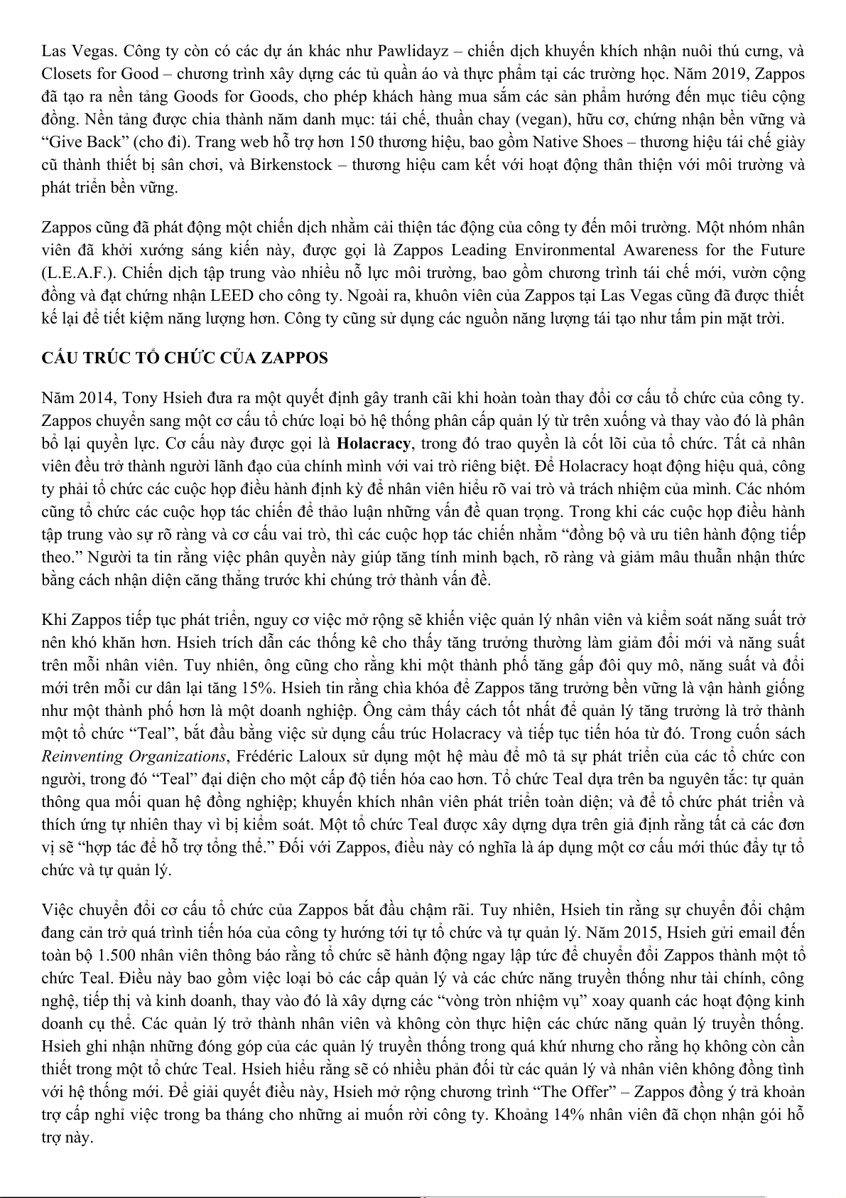 vị sẽ “hợp tác để hỗ trợ tổng thể.” Đối với Zappos, điều này có nghĩa là áp dụng một cơ cấu mới thúc đẩy tự tổ chức và tự quản lý.