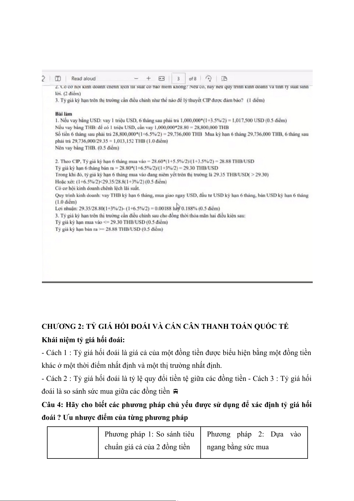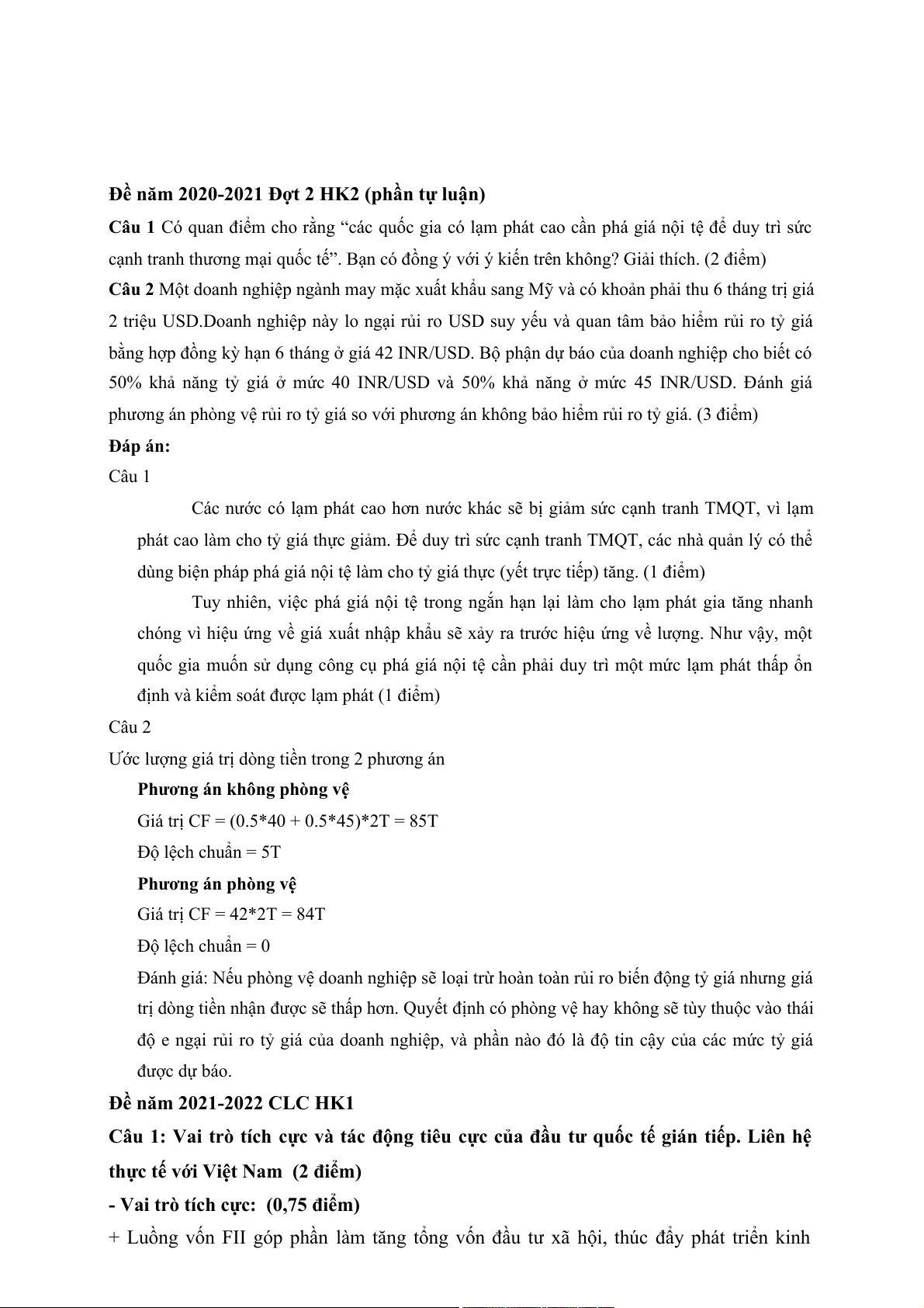 phương án phòng vệ rủi ro tỷ giá so với phương án không bảo hiểm rủi ro tỷ giá. (3 điểm) Đáp án: Câu 1