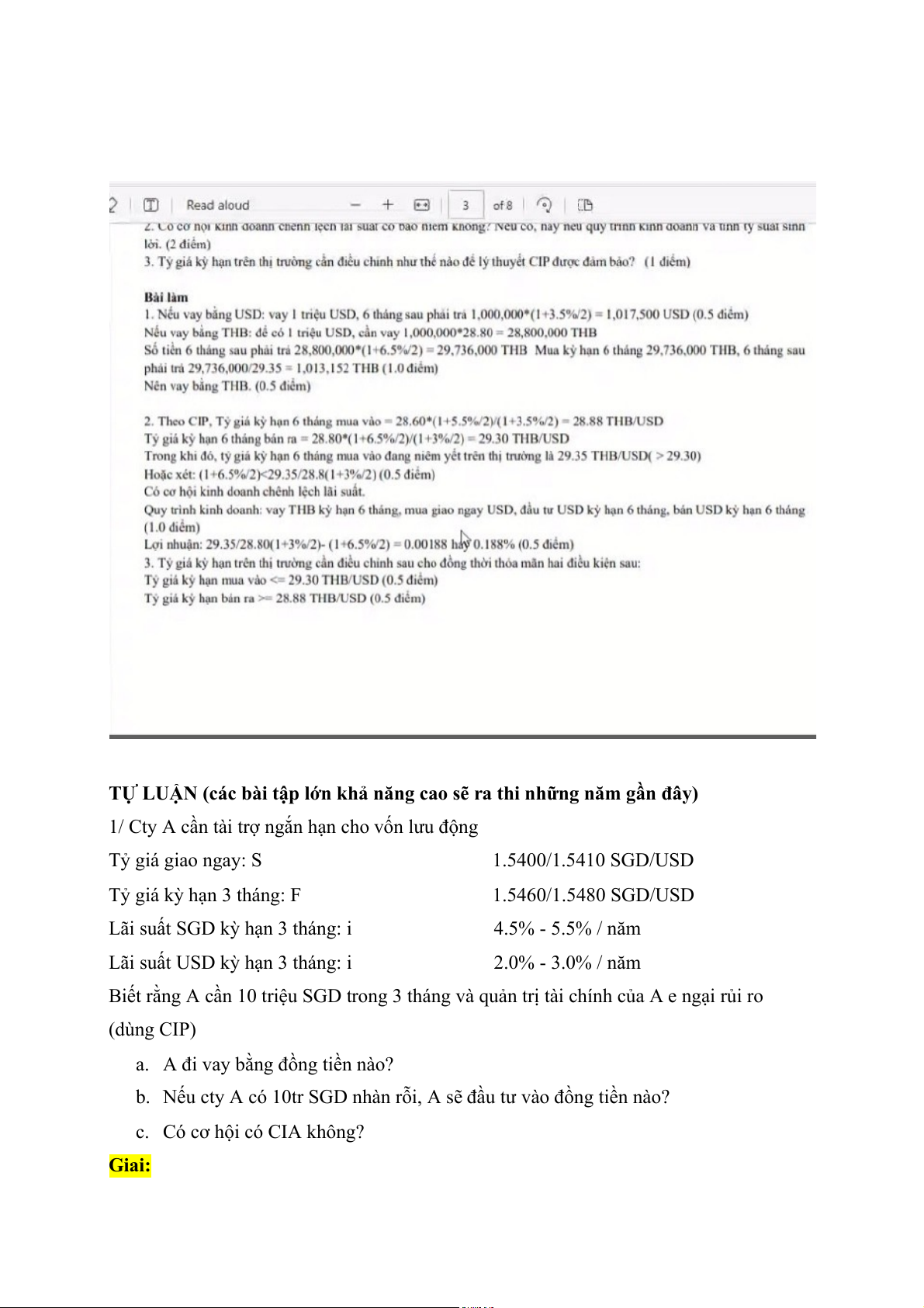 Biết rằng A cần 10 triệu SGD trong 3 tháng và quản trị tài chính của A e ngại rủi ro (dùng CIP)