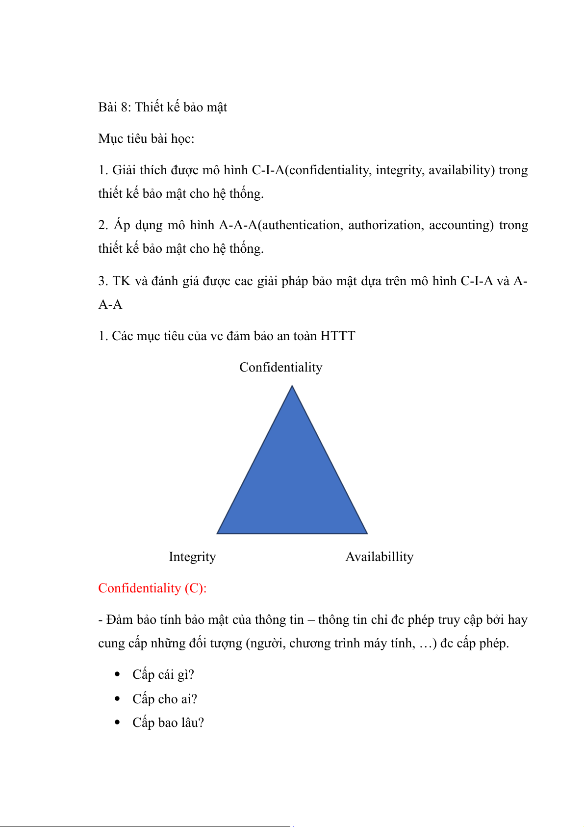 1. Các mục tiêu của vc đảm bảo an toàn HTTT Confidentiality Integrity Availabillity Confidentiality (C):