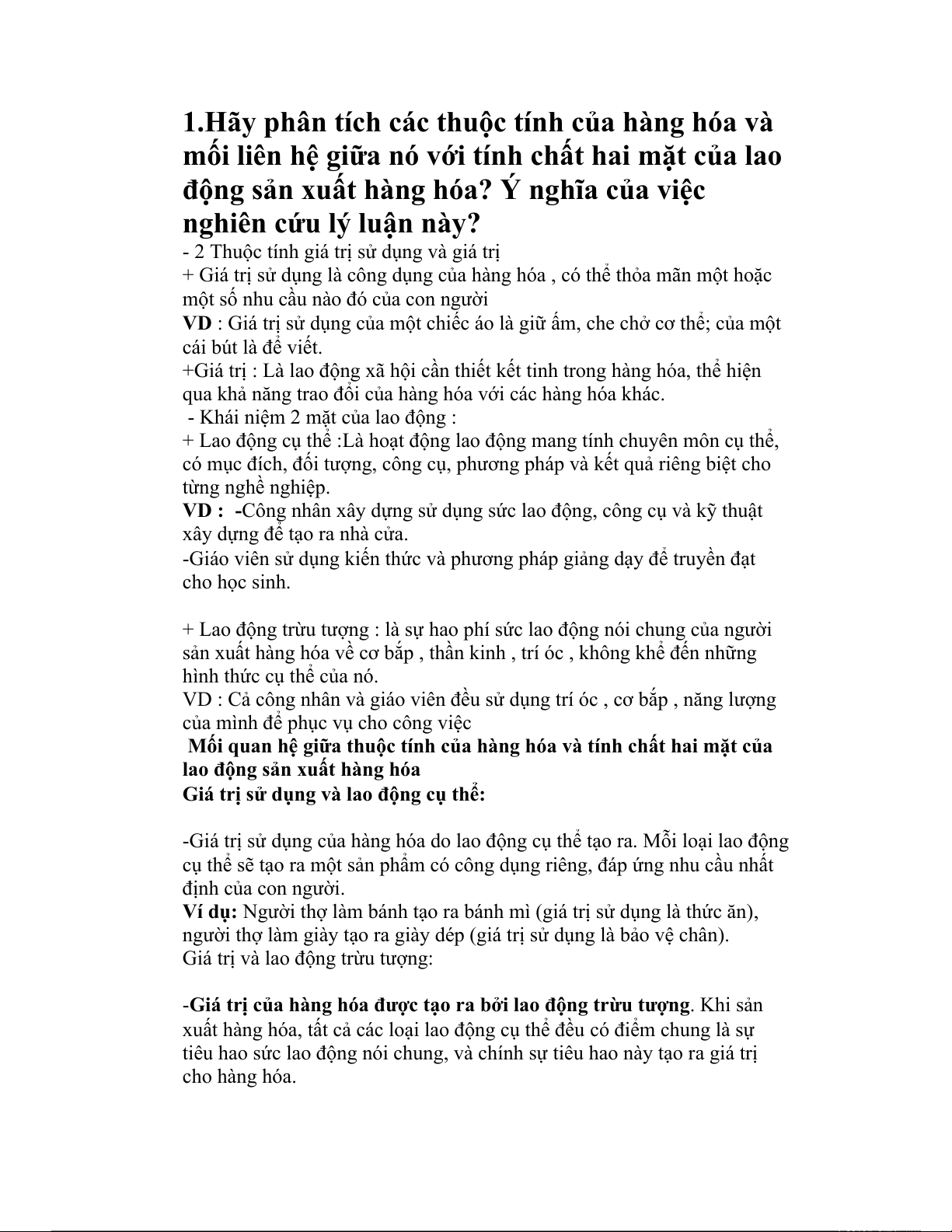 -Giá trị sử dụng của hàng hóa do lao động cụ thể tạo ra. Mỗi loại lao động