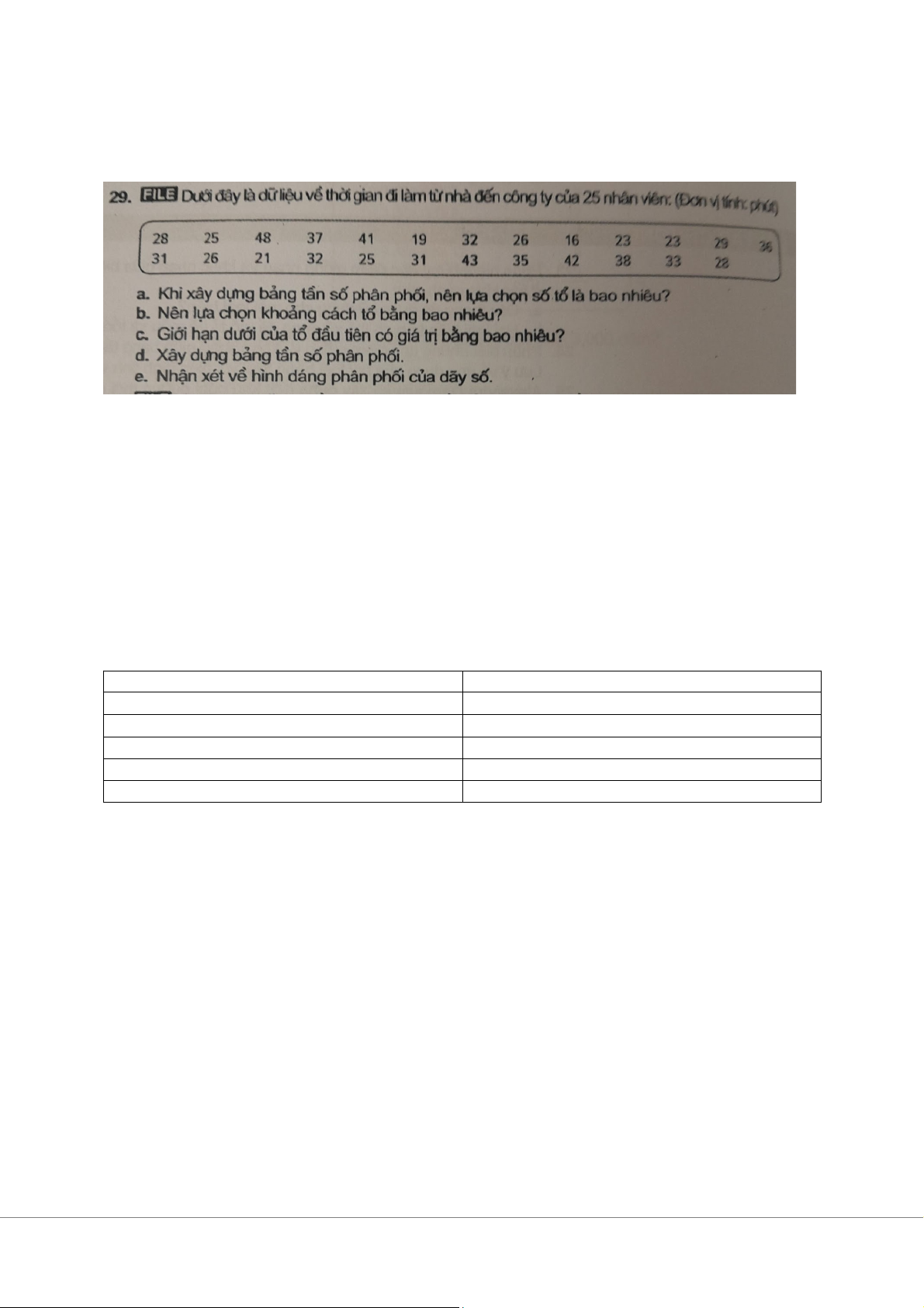 1. Thời gian đi làm từ nhà đến công ty của 25 nhân viên nằm trong khoảng 10 phút đến 50 phút.