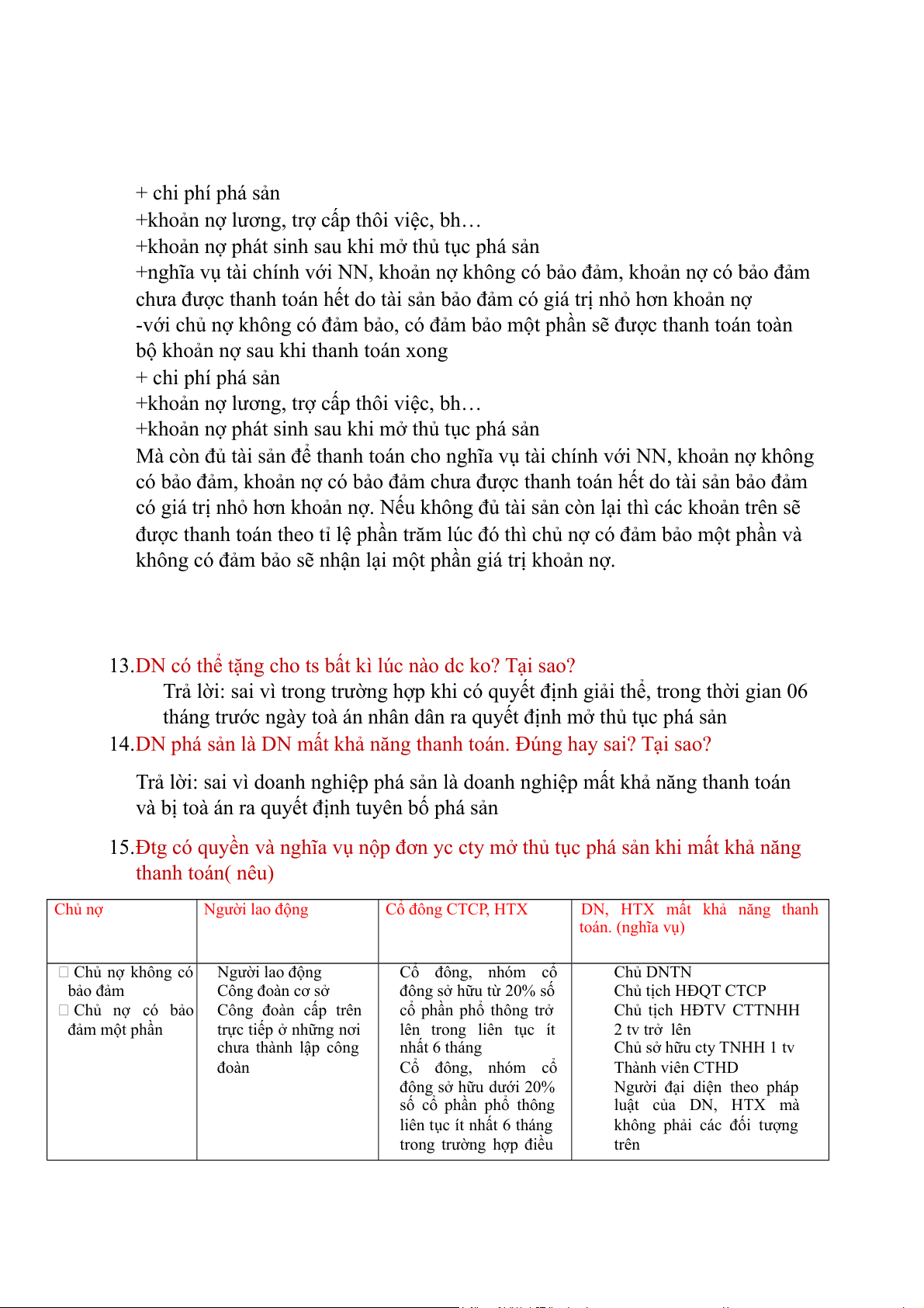 12.Khi giải quyết phá sản, chủ nợ có bảo đảm, có bảo đảm 1 phần, ko có bảo đảm