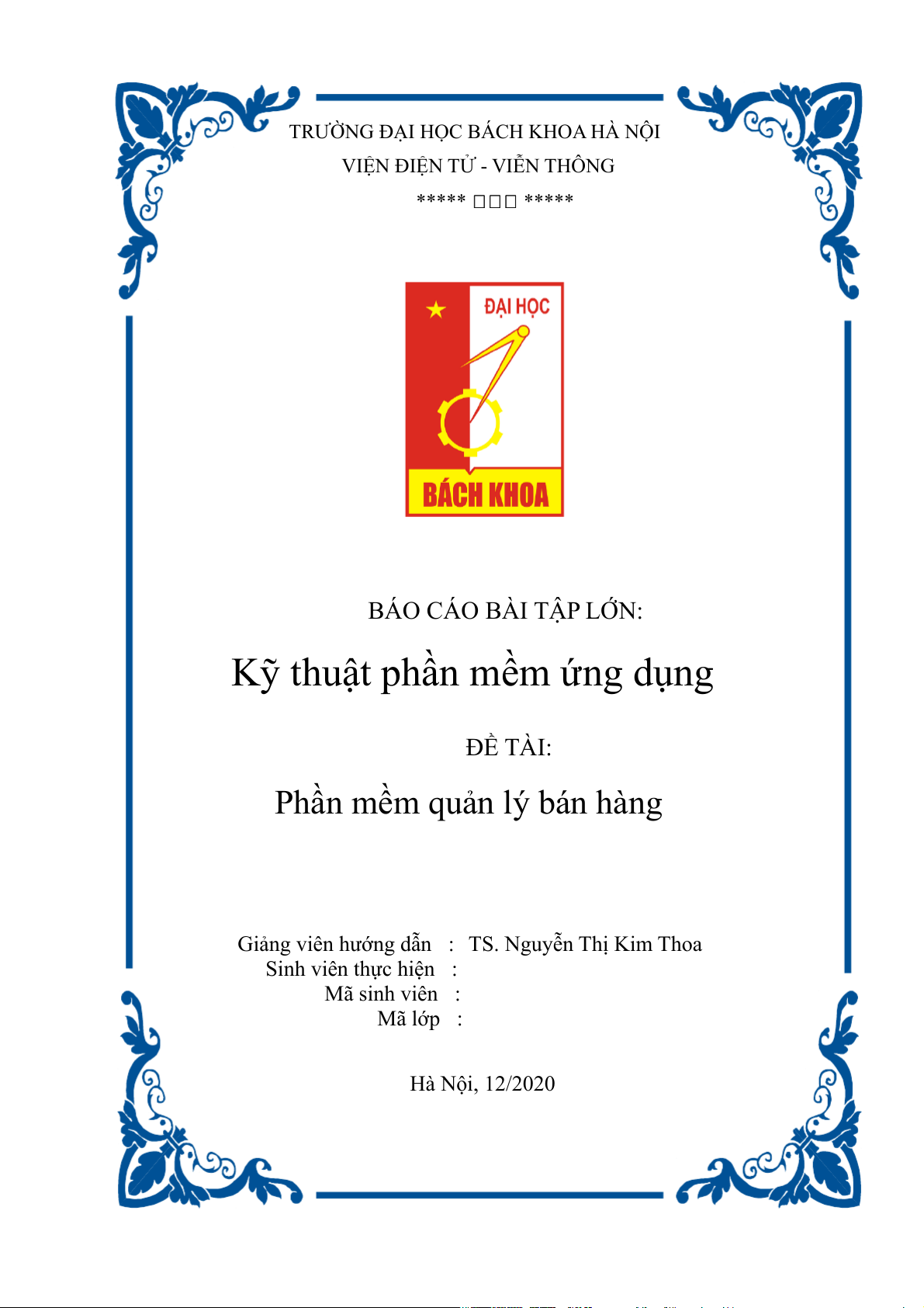 Giảng viên hướng dẫn : TS. Nguyễn Thị Kim Thoa Sinh viên thực hiện : Mã sinh viên : Mã lớp : Hà Nội, 12/2020 QUẢN LÝ BÁN HÀNG MỤC LỤC