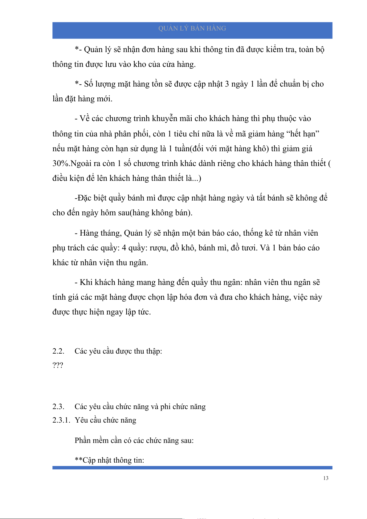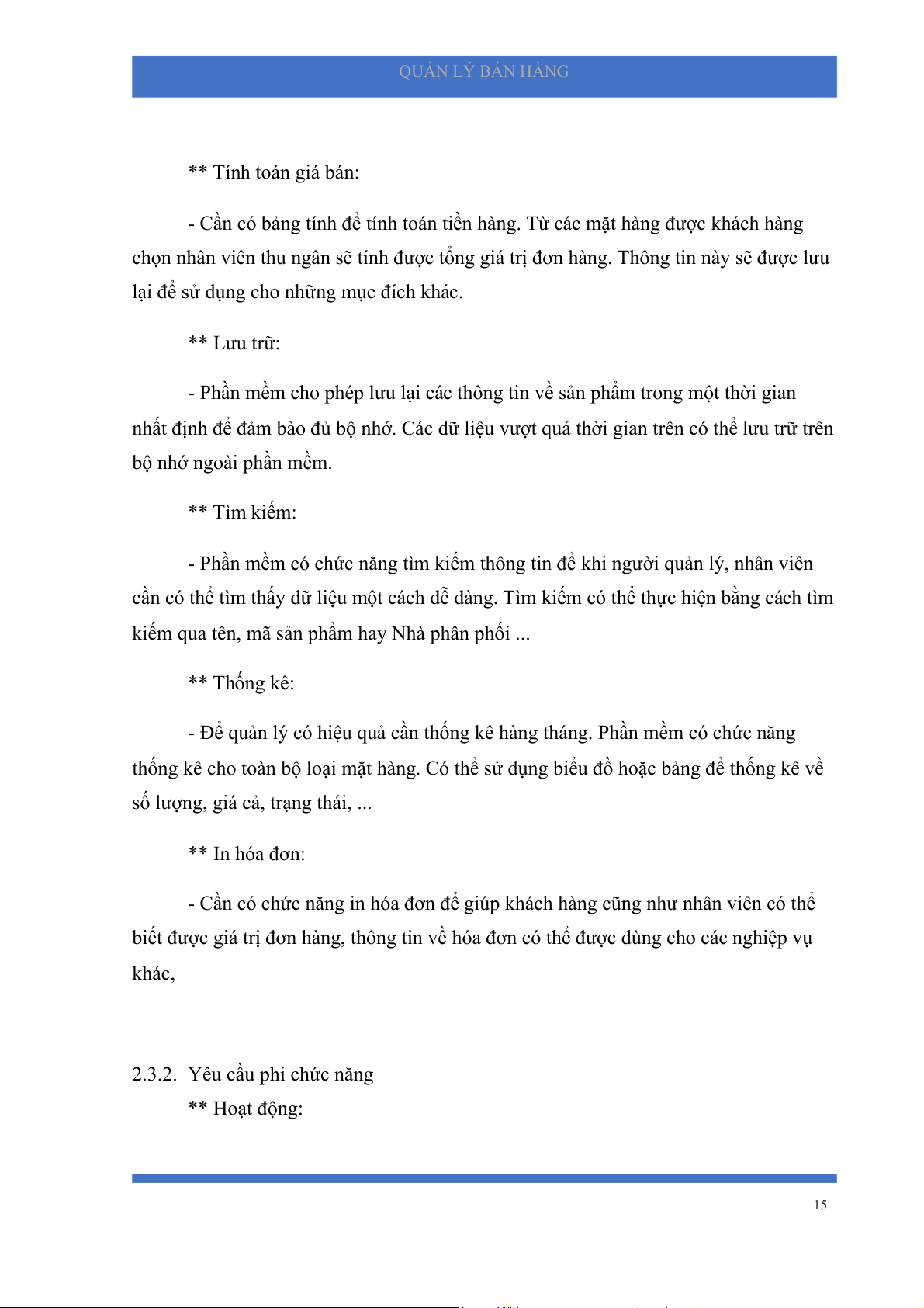 2.3.2. Yêu cầu phi chức năng ** Hoạt động: 15 QUẢN LÝ BÁN HÀNG