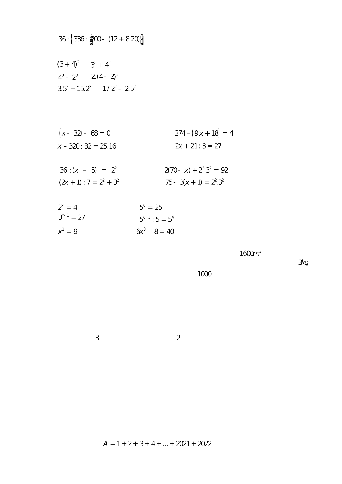Câu 3: Với a = 4; b = 5 thì tích a2b bằng: A. 20 B. 80 C. 90 D. 100 Câu 4: Cho . Số x bằng : A. 1 B. 0 C. 2 D. 3.