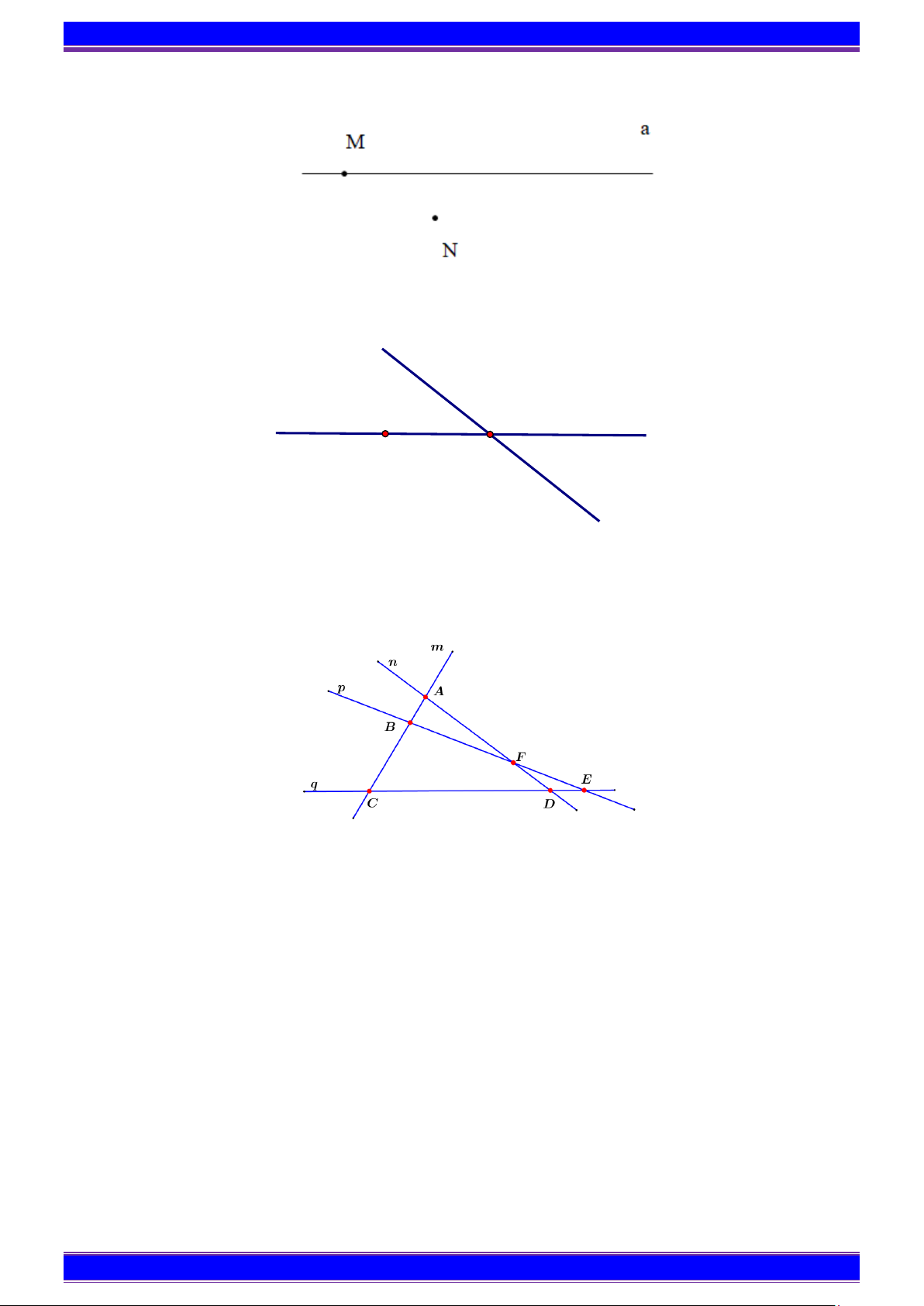 Trên hình vẽ, điểm M thuộc bao nhiêu đường thẳng? A. 4 . B. 3. C. 2 . D. 1. Câu 12: Cho hình vẽ Chọn câu sai A. M ∈ ; a M ∈b . B. N ∉ ; b N ∈ a .