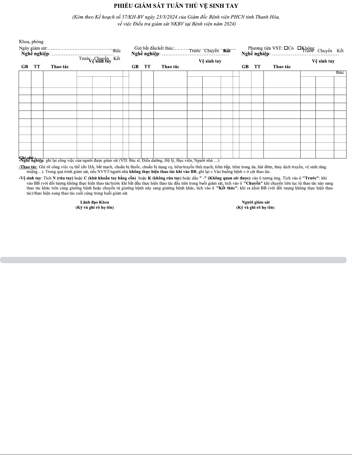 PHIẾU GIÁM SÁT VỆ SINH TAY - Bệnh viện PHCN 2024