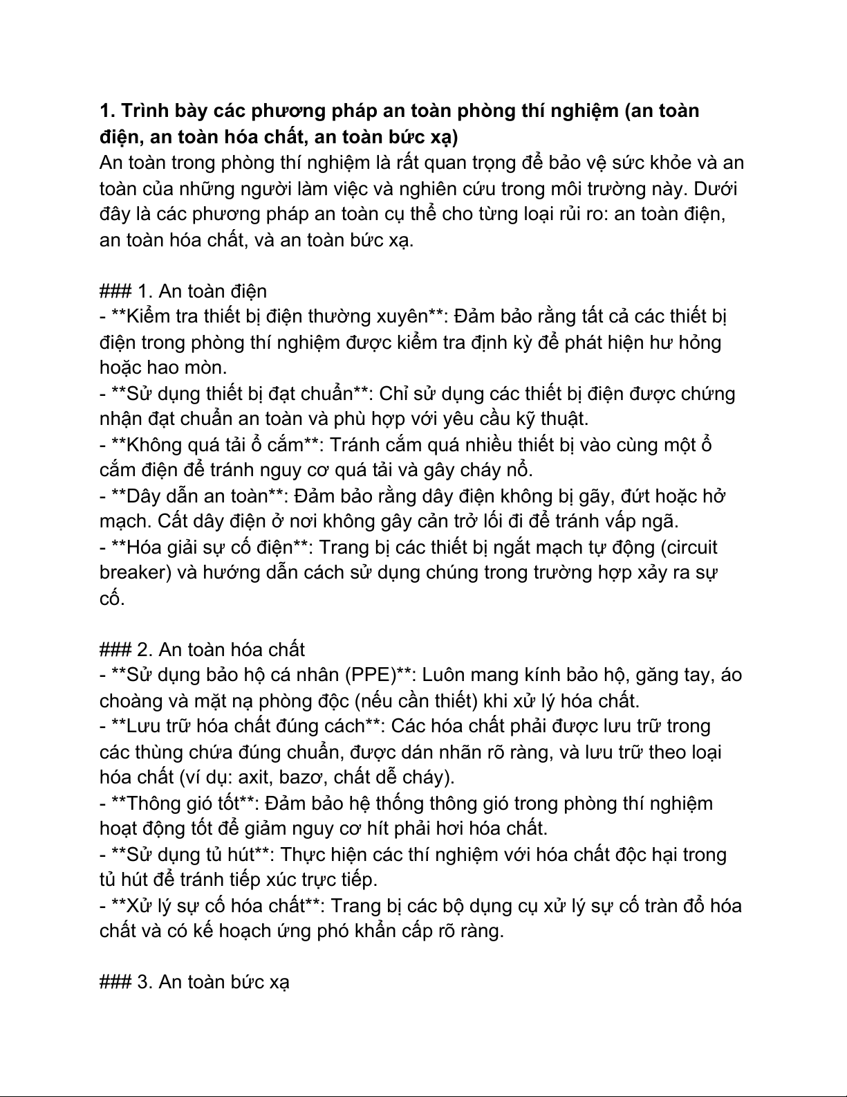 1. Trình bày các phương pháp an toàn phòng thí nghiệm (an toàn