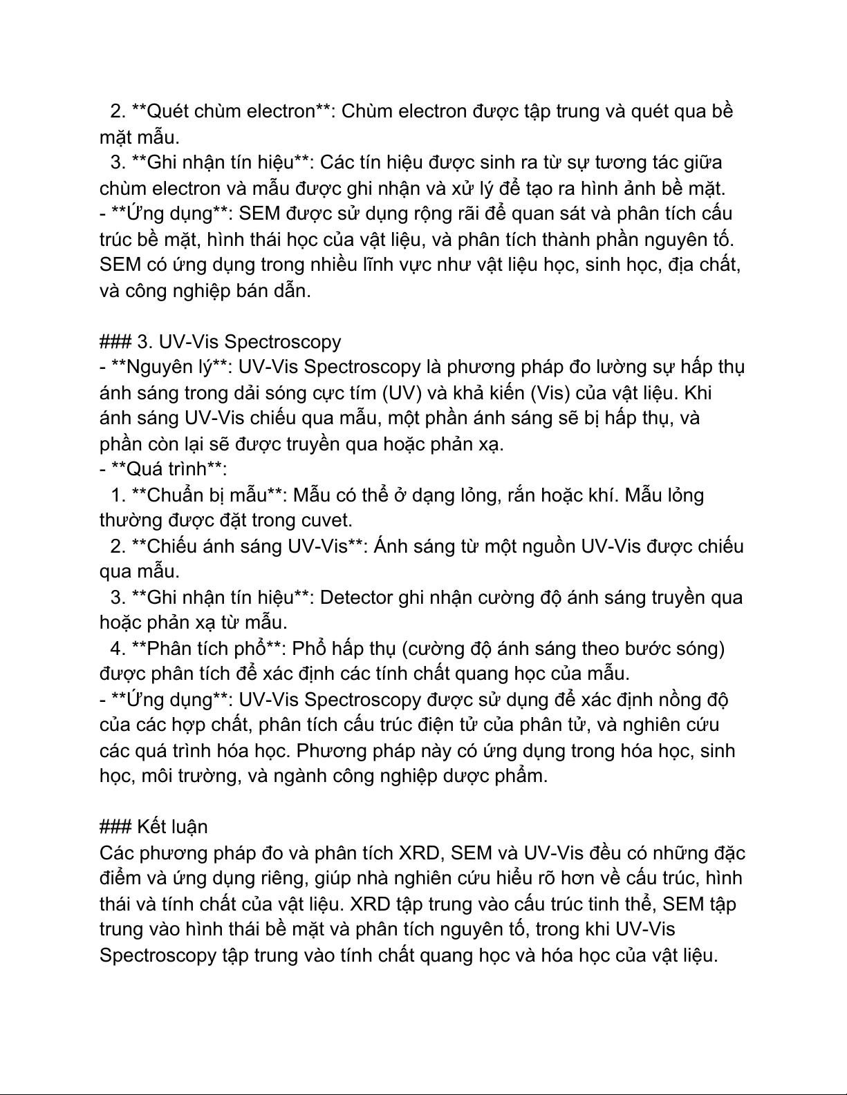SEM có ứng dụng trong nhiều lĩnh vực như vật liệu học, sinh học, địa chất, và công nghiệp bán dẫn. ### 3. UV-Vis Spectroscopy