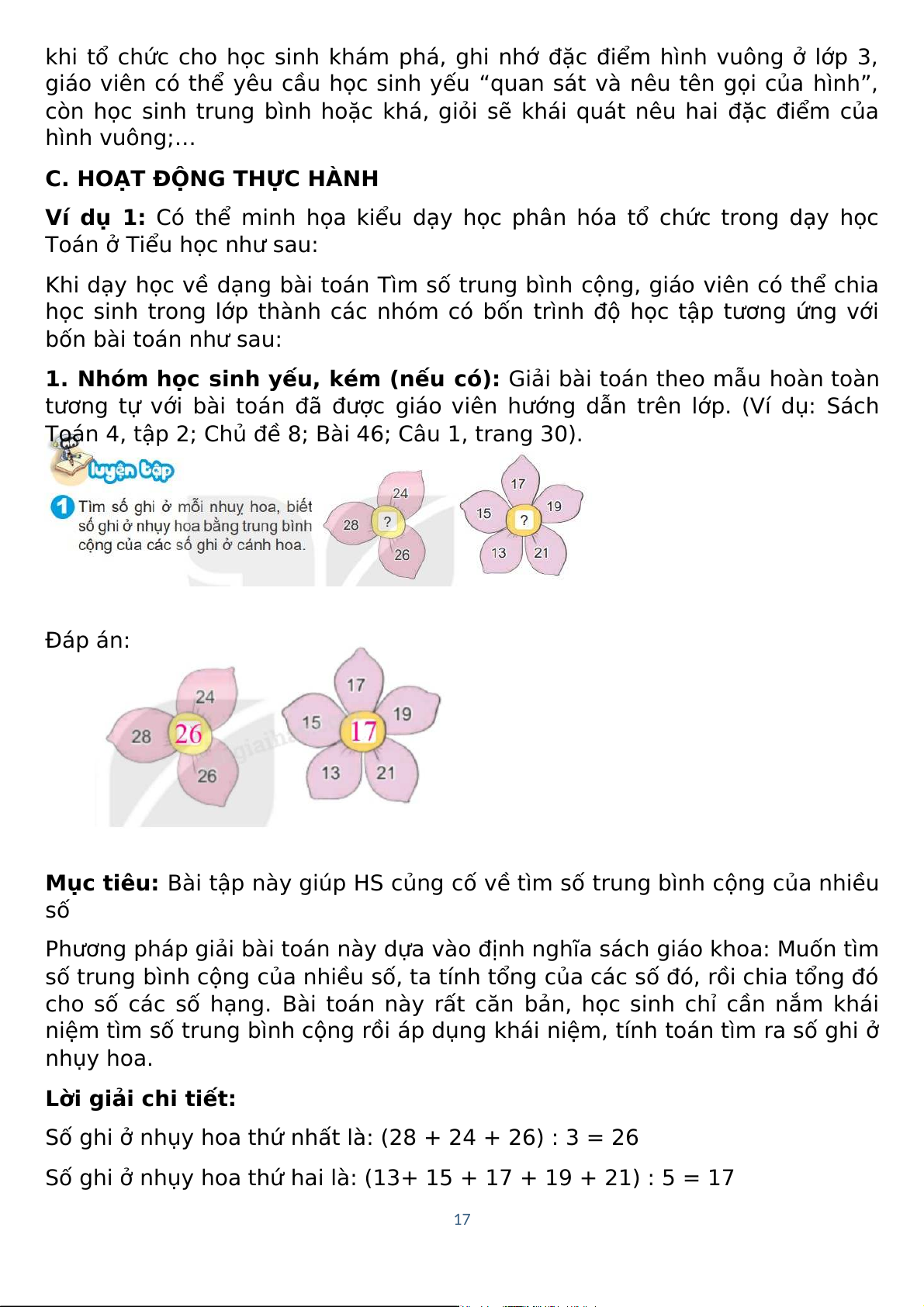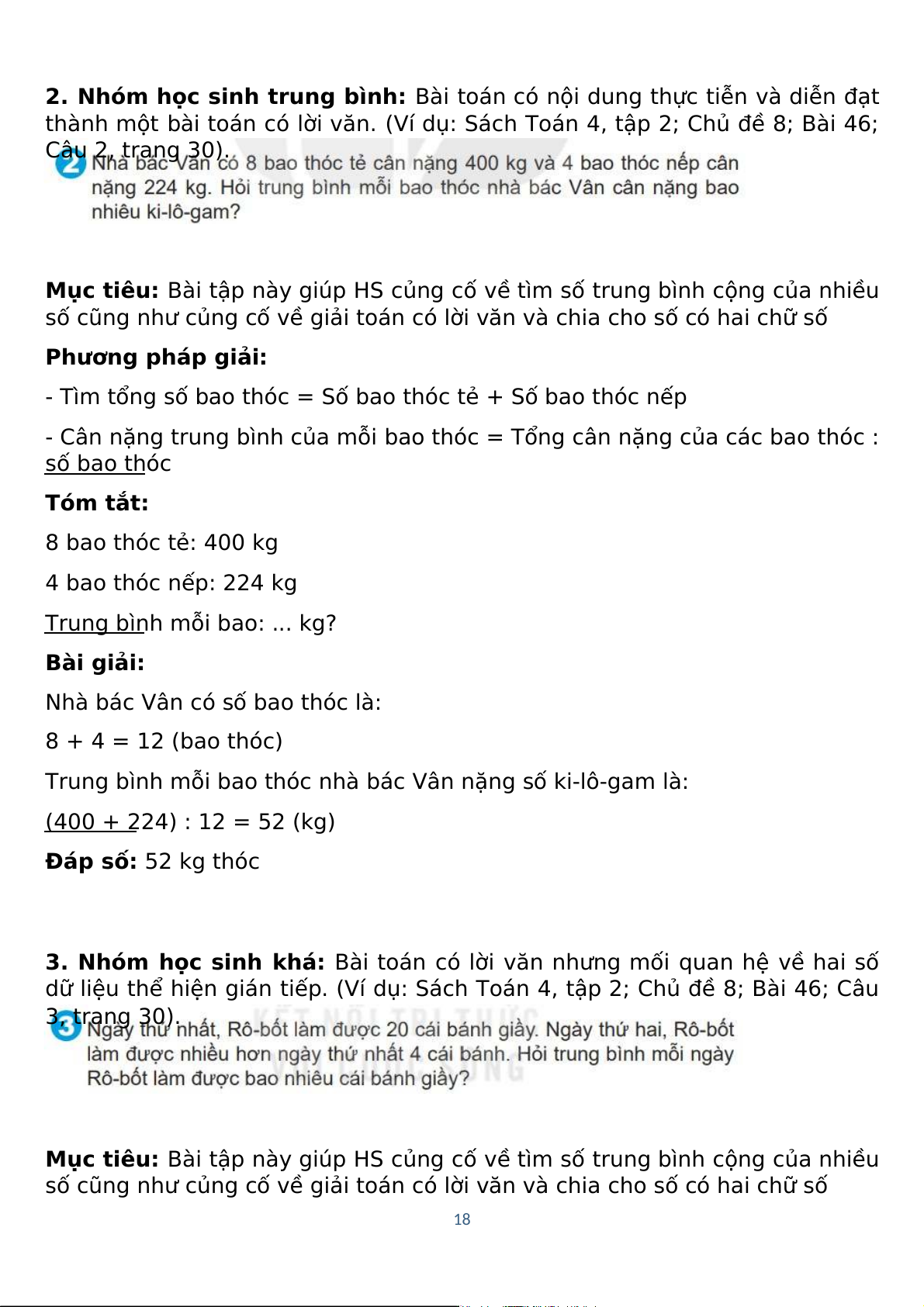 Khi dạy học về dạng bài toán Tìm số trung bình cộng, giáo viên có thể chia