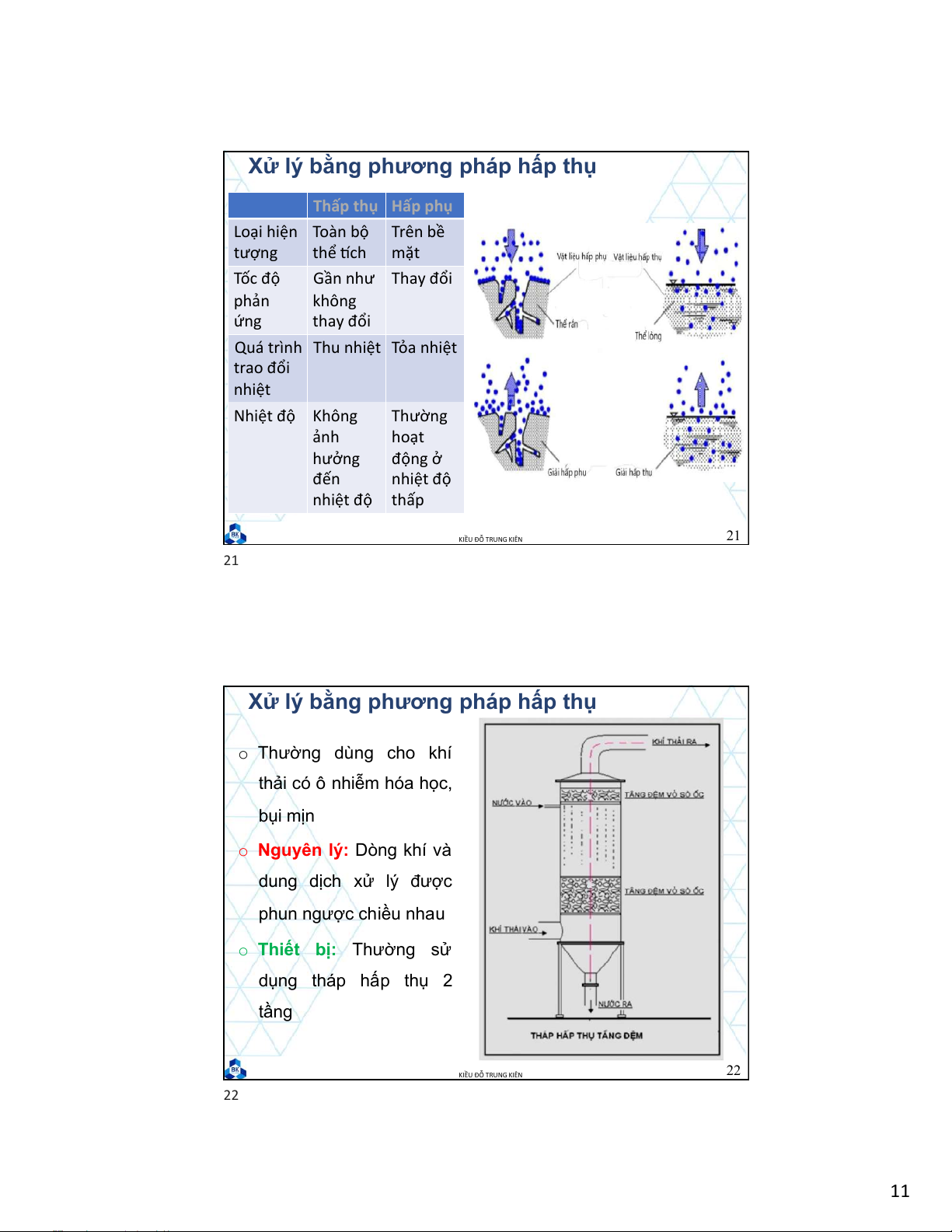 o Nguyên lý: Dòng khí và dung dịch xử lý được phun ngược chiều nhau o Thiết bị: Thường sử dụng tháp hấp thụ 2 tầng 22 KIỀU ĐỖ TRUNG KIÊN 22 11