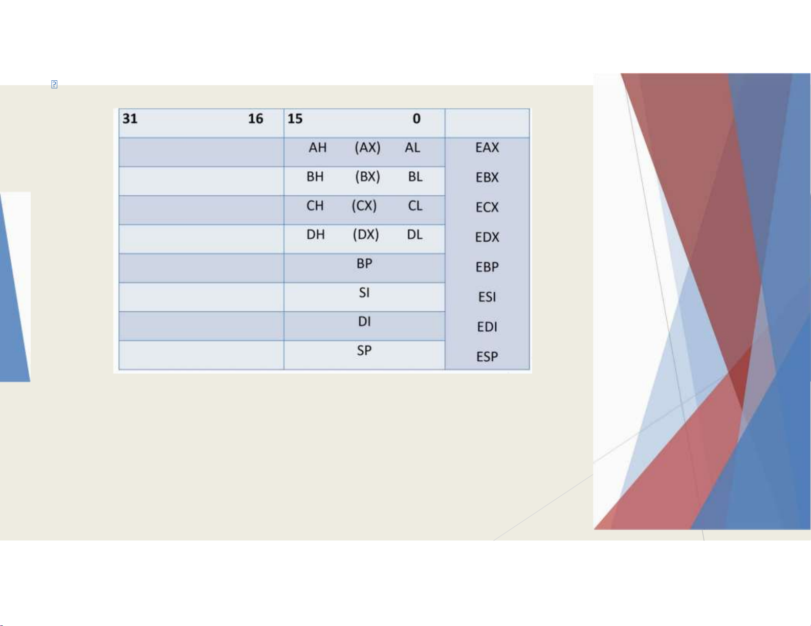 • Thanh ghi cờ trạng thái EFLAGS. EFLAGS là thanh ghi 32 bit. Thanh ghi trạng thái EFLAGS