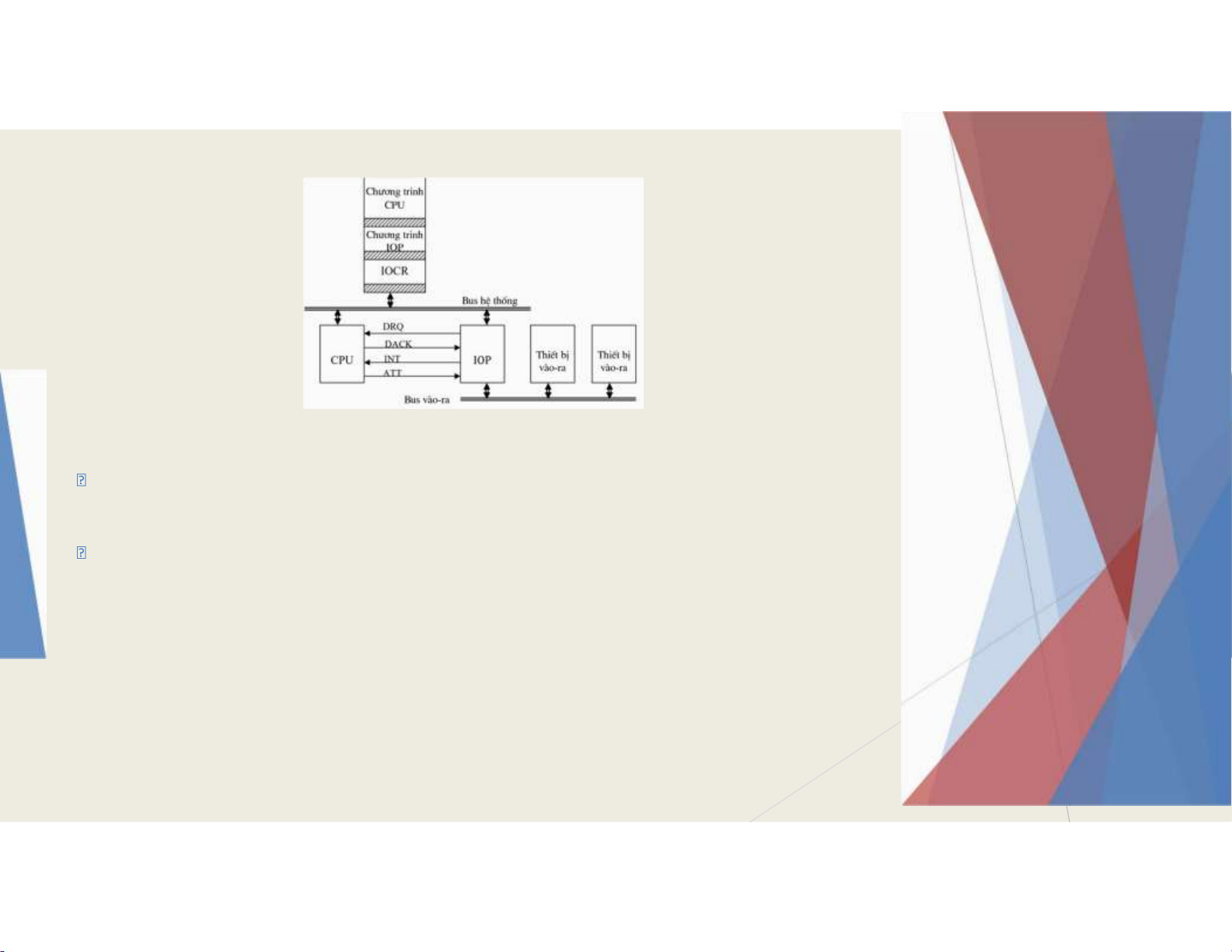 CPU ra lệnh cho bộ xử lý vào-ra thực hiện chưương trỡnh iều khiển vào-ra.