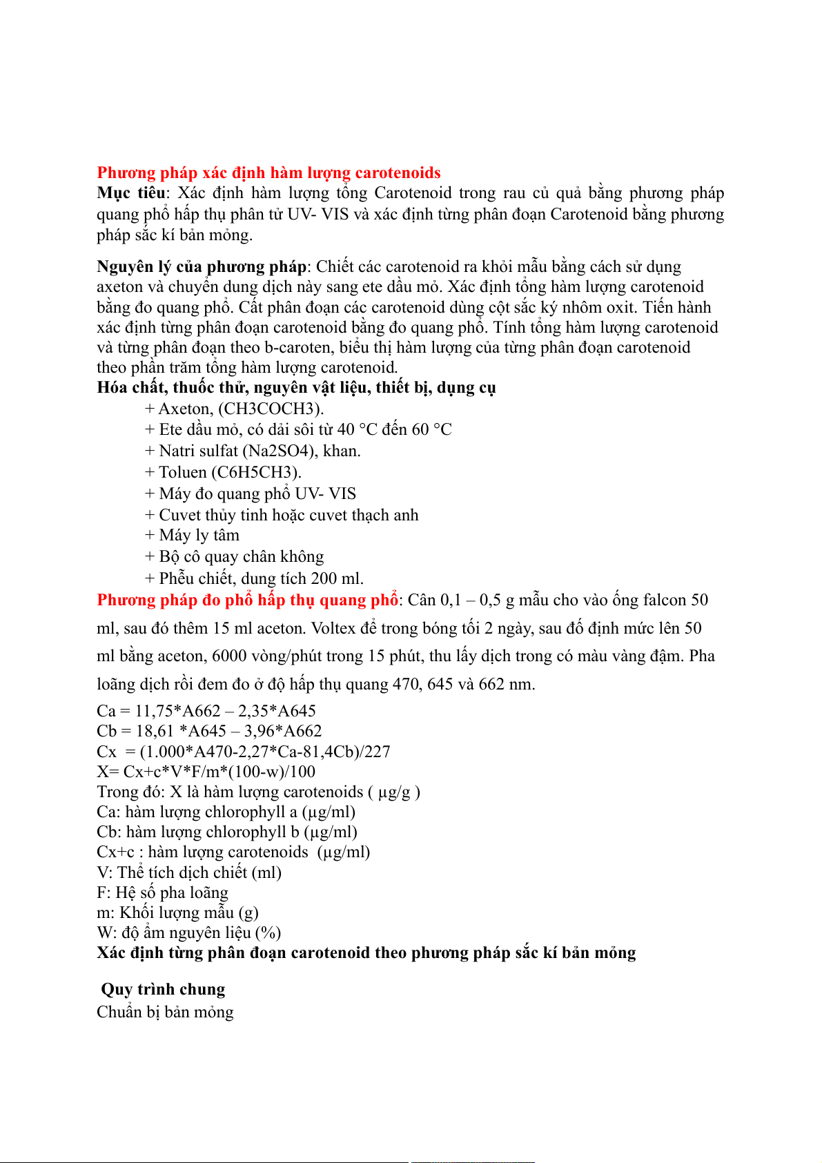 Nguyên lý của phương pháp: Chiết các carotenoid ra khỏi mẫu bằng cách sử dụng