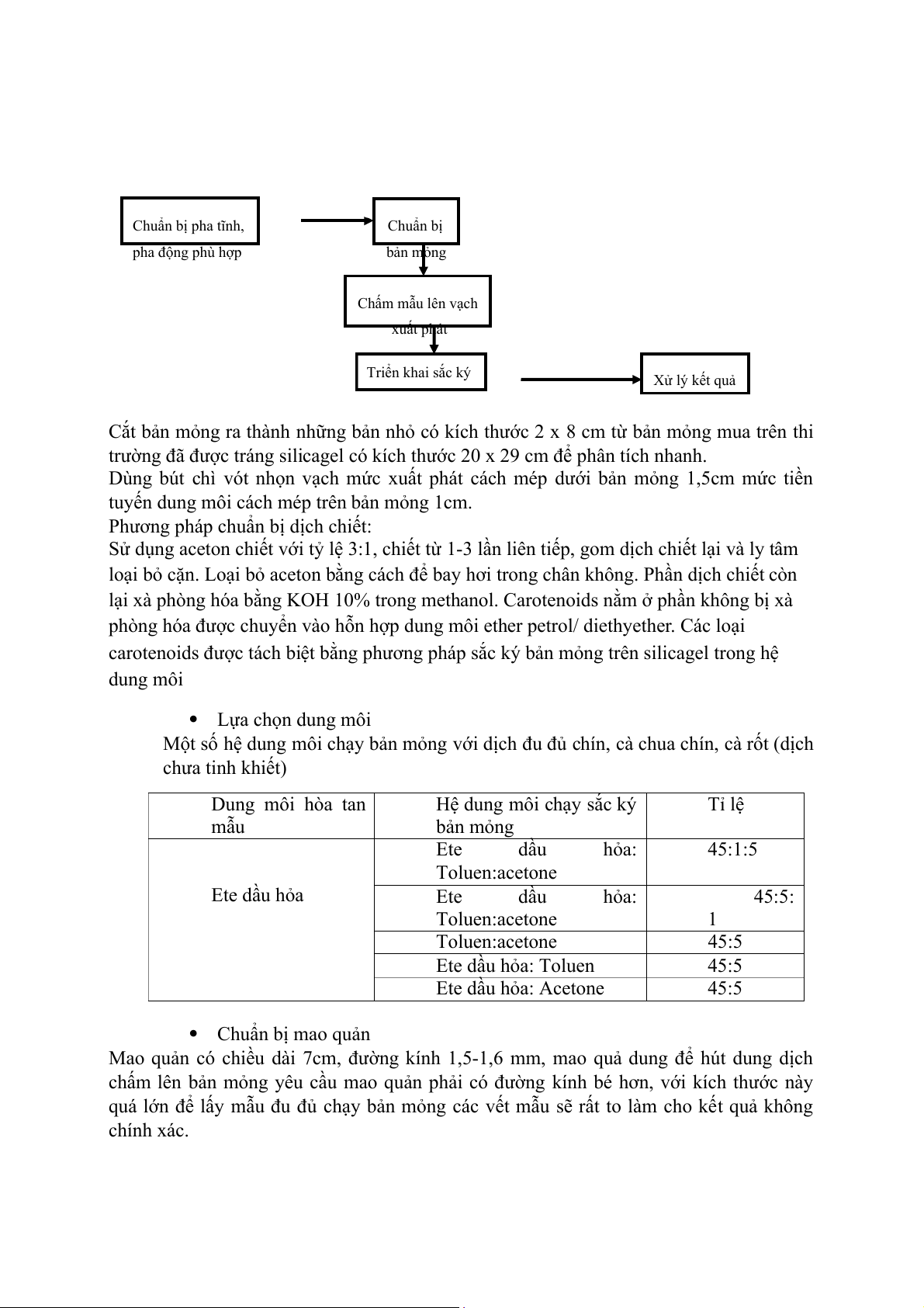 Xác định từng phân đoạn carotenoid theo phương pháp sắc kí bản mỏng Quy trình chung Chuẩn bị bản mỏng Chuẩn bị pha tĩnh, Chuẩn bị pha động phù hợp bản mỏng Chấm mẫu lên vạch xuất phát Triển khai sắc ký Xử lý kết quả