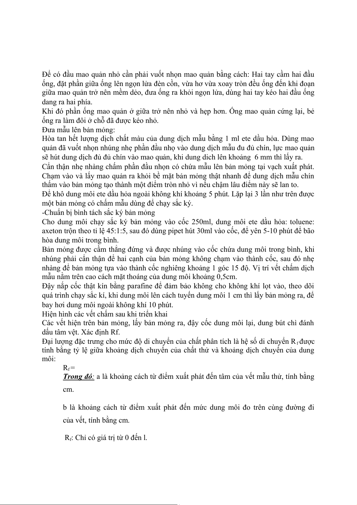 Hệ dung môi chạy sắc ký Tỉ lệ mẫu bản mỏng Ete dầu hỏa: 45:1:5 Toluen:acetone Ete dầu hỏa Ete dầu hỏa: 45:5: Toluen:acetone 1 Toluen:acetone 45:5 Ete dầu hỏa: Toluen 45:5 Ete dầu hỏa: Acetone 45:5 Chuẩn bị mao quản