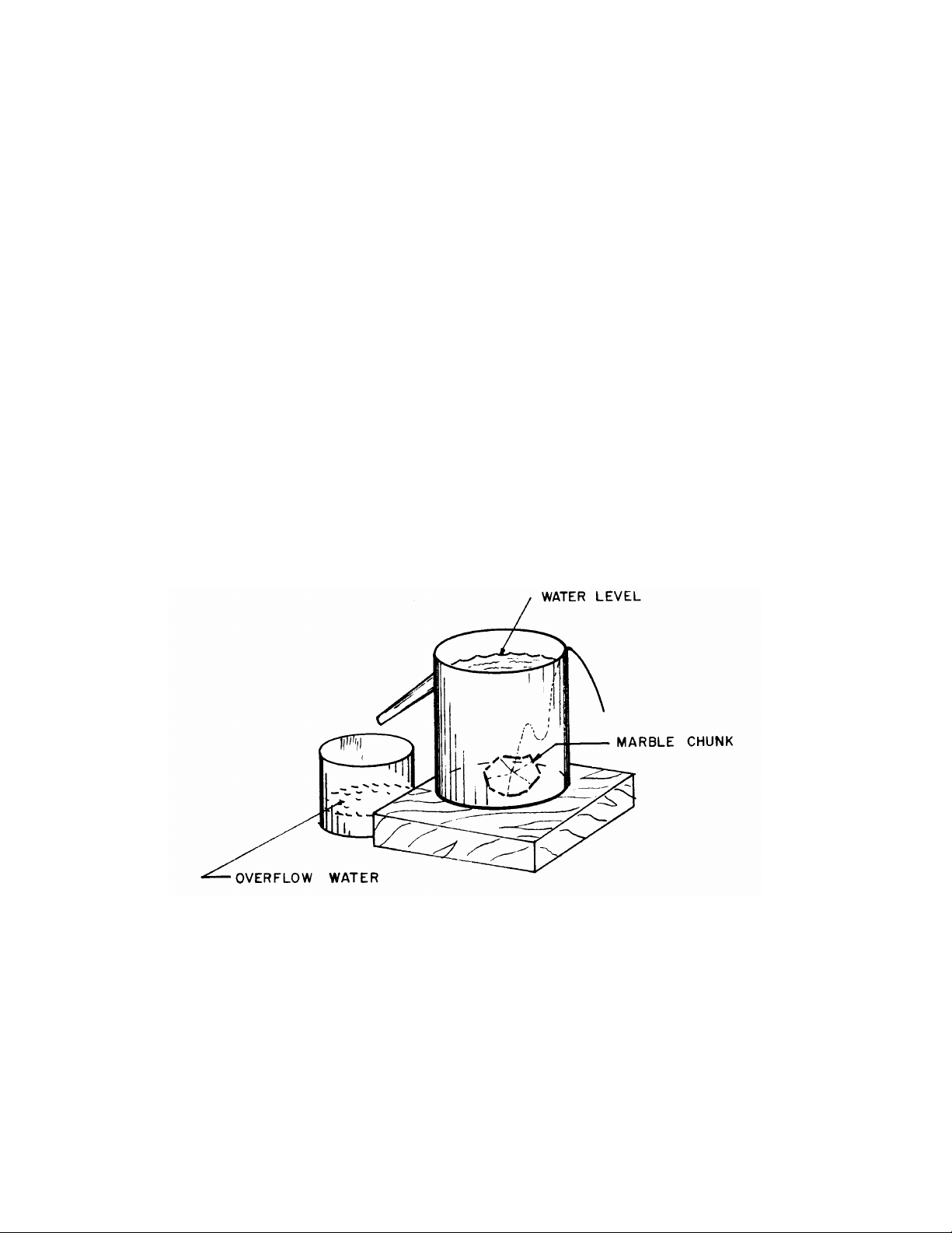 Test samples made of marble, metal and wood; balance, overflow can with spout, beaker, metal can,