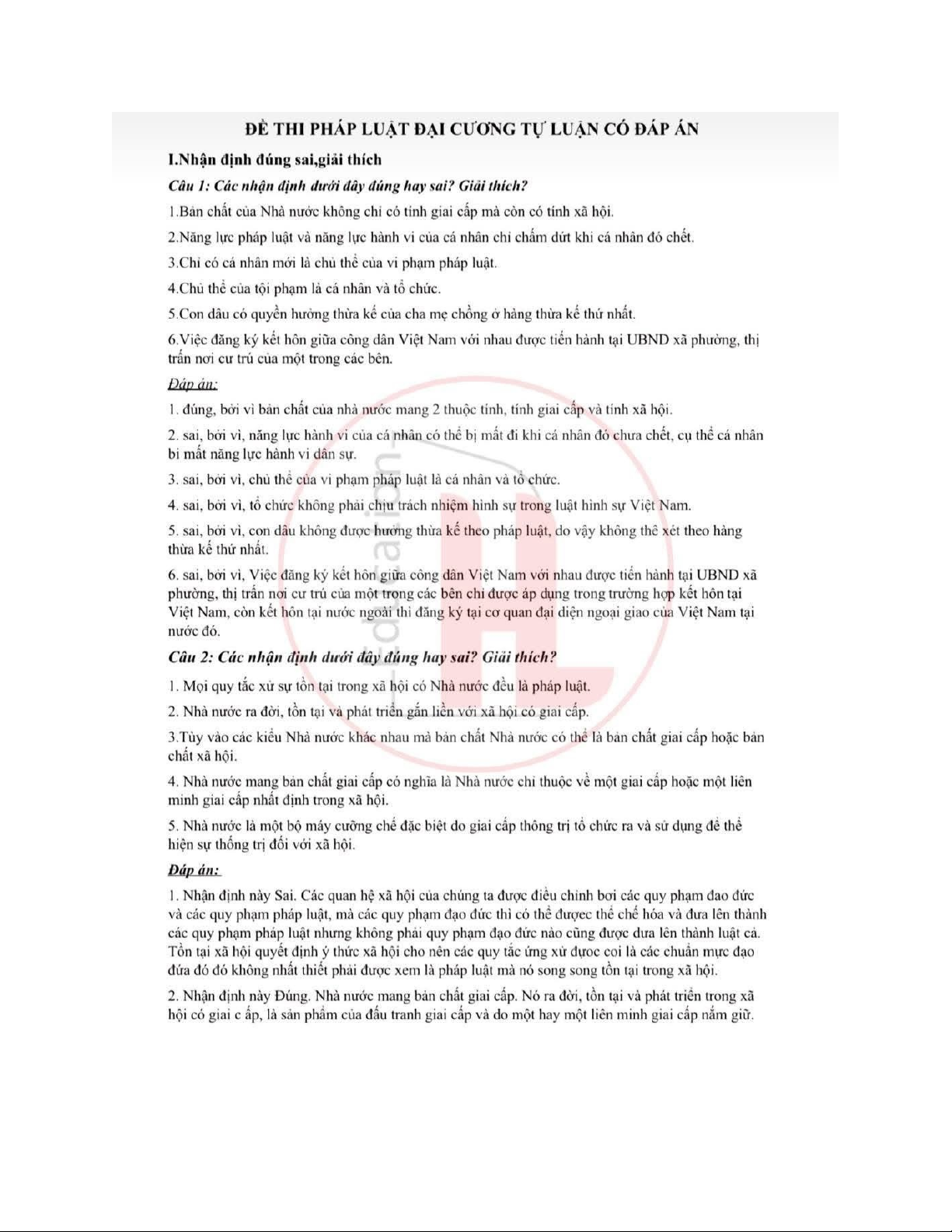 Đề thi pháp luật đại cương tự luận có đáp án | Trường Đại học Ngân hàng Thành phố Chí Minh . Tài liệu giúp bạn tham khảo, ôn tập và đạt kết quả cao. Mời đọc đón xem!