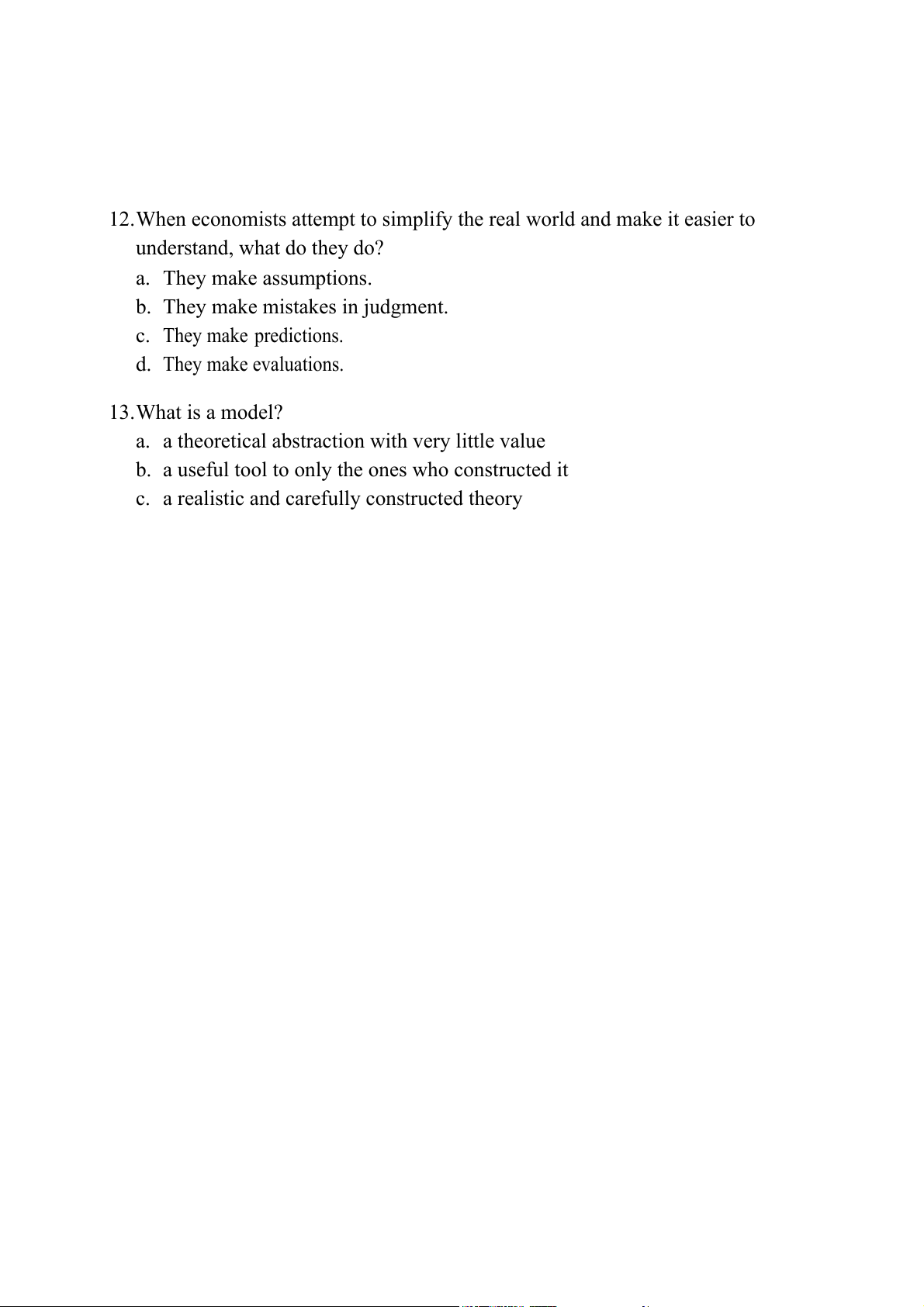 12.When economists attempt to simplify the real world and make it easier to understand, what do they do? a. They make assumptions.