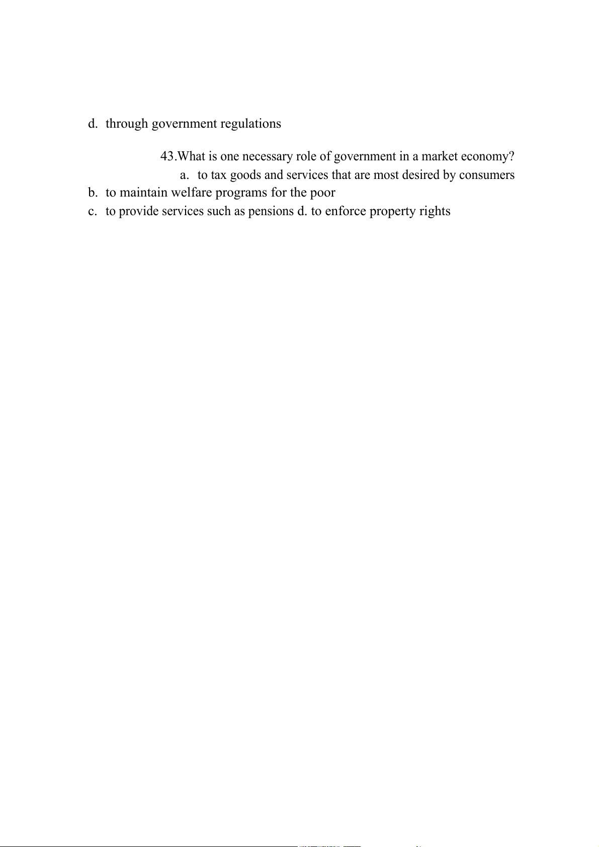 46.Which of the following is NOT a reason for the government to intervene in the market? a. to promote efficiency b. to enforce property rights c. to promote equity d. to protect an industry