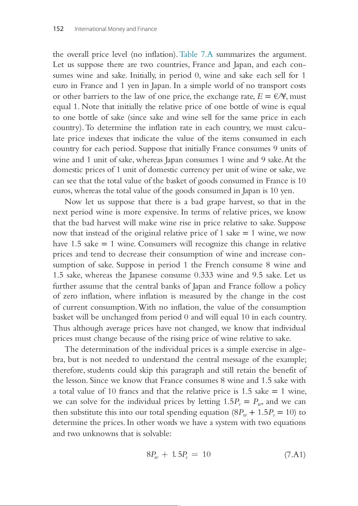 Table 7.A The effect of a relative price change on the exchange rate France Period 0 Period 1 Price Quantity Price Quantity (in Euros) consumed (in Euros) consumed Wine 1 9 1.111 8 Sake 1 1 0.741 1.5 Value of consumption 10 10 Japan Period 0 Period 1 Price Quantity Price Quantity (in Yen) consumed (in Yen) consumed Wine 1 1 1.5 0.333 Sake 1 9 1 9.5 Value of consumption 10 10