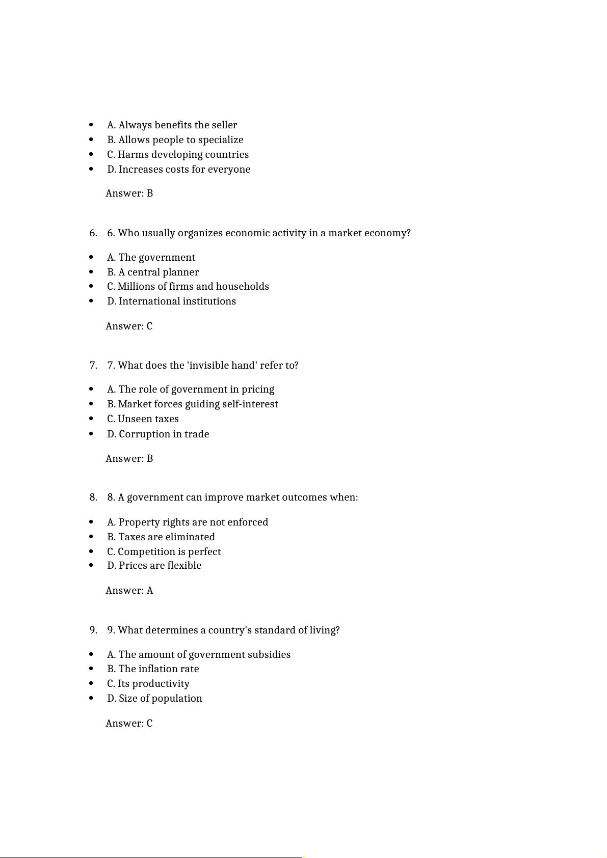 4. 4. What is a common incentive in markets? A. Taxation B. Prices C. Government intervention D. Regulations ✅ Answer: B 5. 5. Trade: A. Always benefits the seller B. Allows people to specialize C. Harms developing countries
