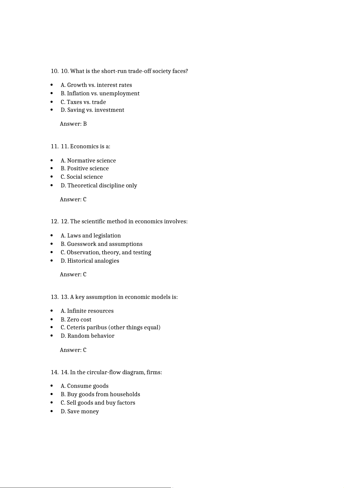 10. 10. What is the short-run trade-off society faces? A. Growth vs. interest rates B. Inflation vs. unemployment C. Taxes vs. trade D. Saving vs. investment ✅ Answer: B 11. 11. Economics is a: A. Normative science B. Positive science C. Social science D. Theoretical discipline only ✅ Answer: C