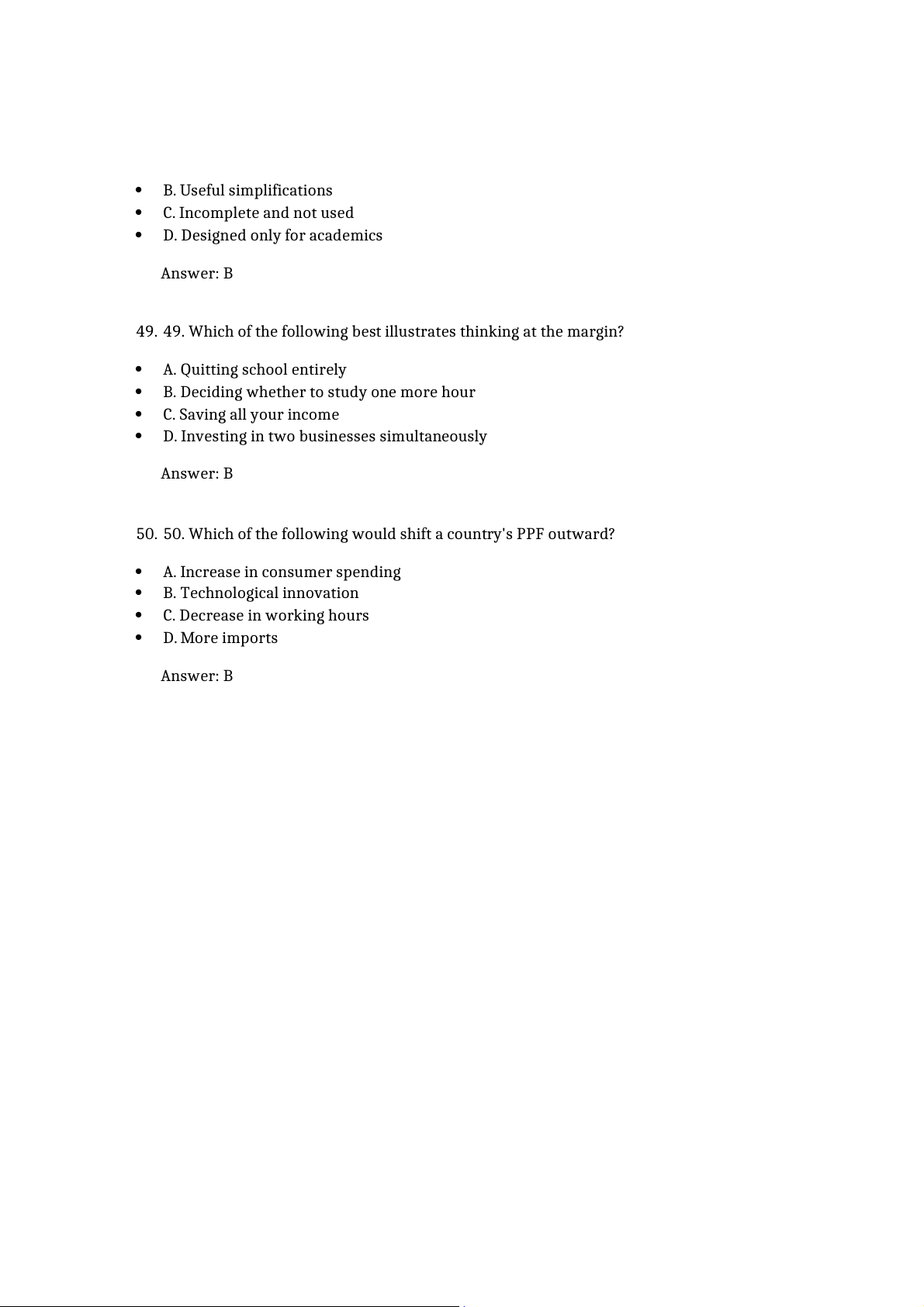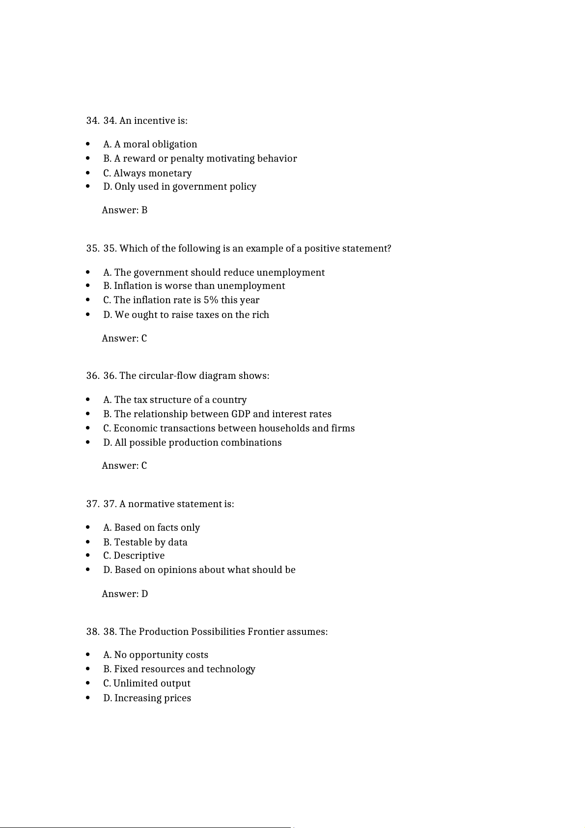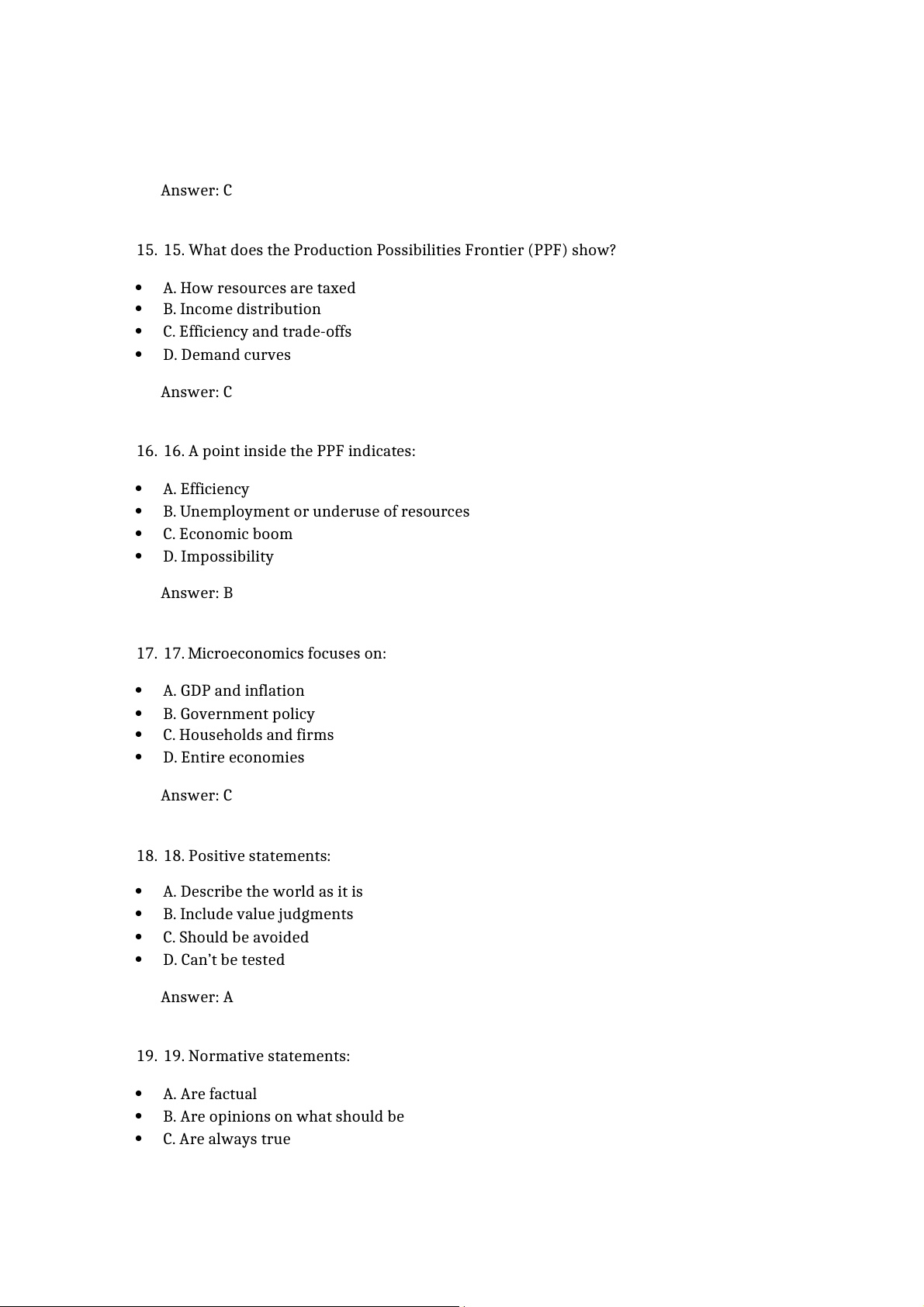 17. 17. Microeconomics focuses on: A. GDP and inflation B. Government policy C. Households and firms D. Entire economies ✅ Answer: C 18. 18. Positive statements: A. Describe the world as it is B. Include value judgments C. Should be avoided D. Can’t be tested ✅ Answer: A 19. 19. Normative statements: A. Are factual