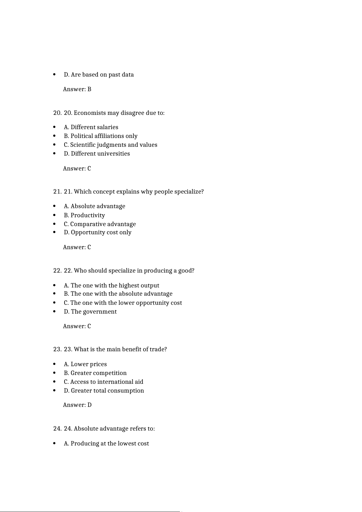 26. 26. Specialization increases: A. Prices B. Economic efficiency C. Tariffs D. Income inequality ✅ Answer: B