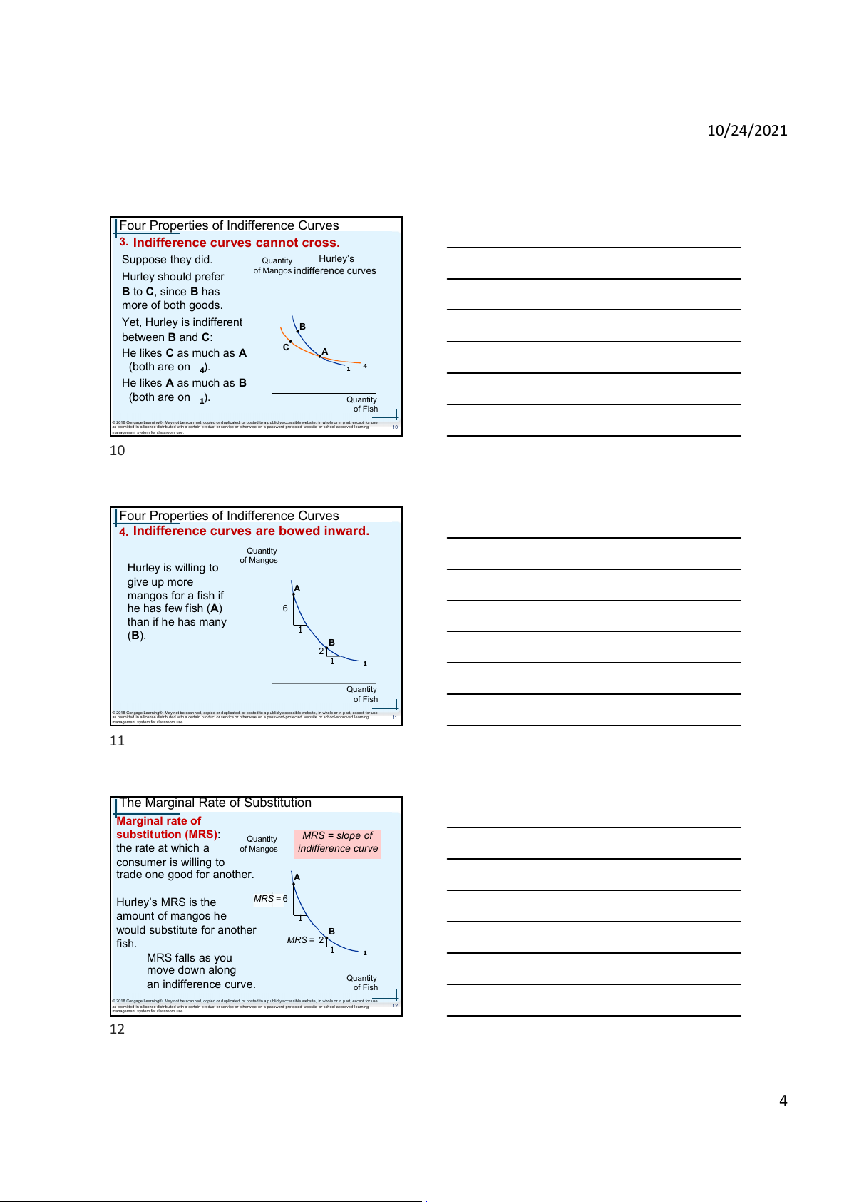 3. Indifference curves cannot cross. Suppose they did. Quantity Hurley’s of Mangos Hurley should prefer indifference curves B to C, since B has more of both goods. Yet, Hurley is indifferent B between B and C: He likes C C as much as A A (both are on I ). I I4 4 1 He likes A as much as B (both are on I ). 1 Quantity of Fish