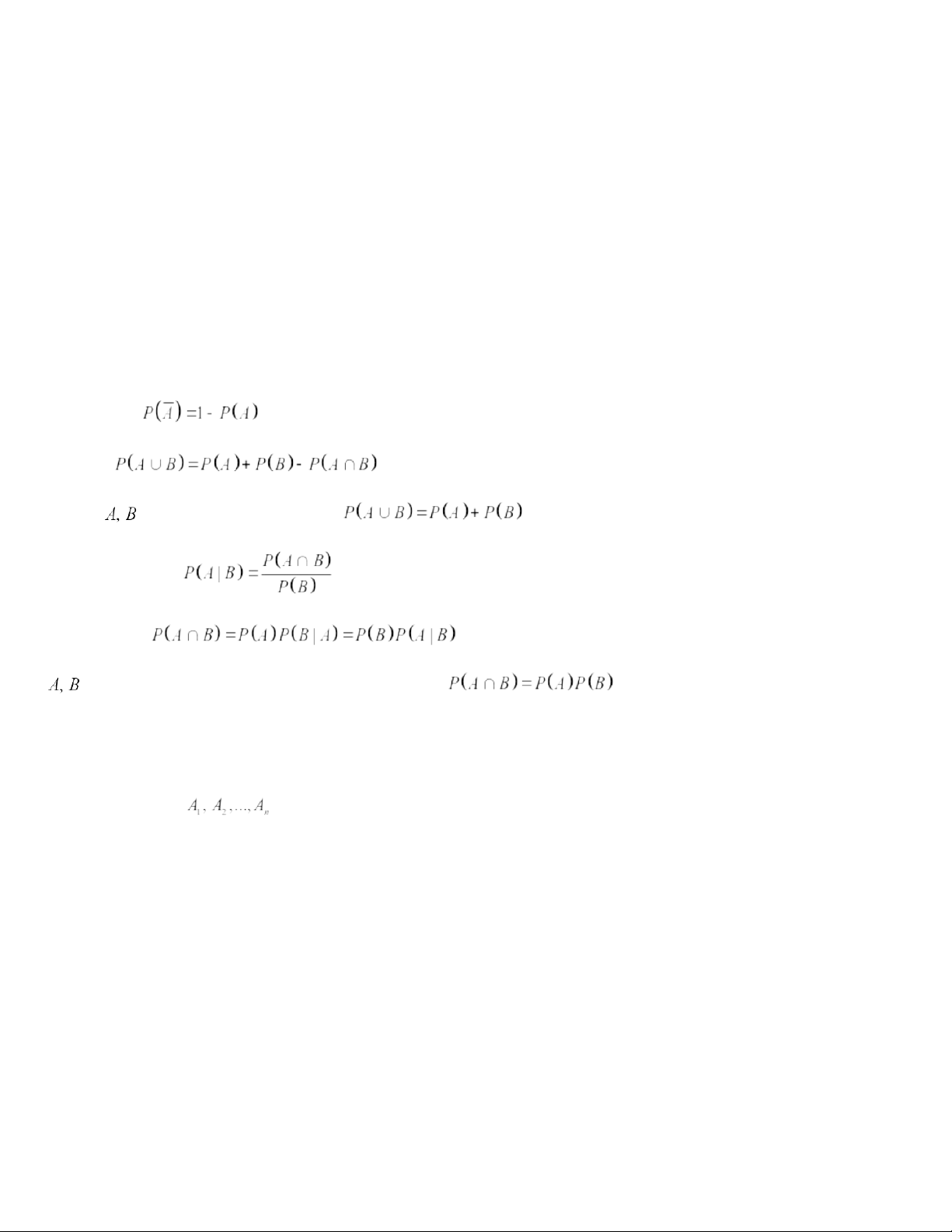 + Step 3: Find the system of events which is both mutually exclusive and collectively exhaustive (compute the complement if needed). + Step 4: Apply the formula. II. Probability rules 1. Complement rule: . 2. Addition rule: . n particular, if are mutually exclusive, then . 3. Conditional probability: . 4. Multiplication rule: Events