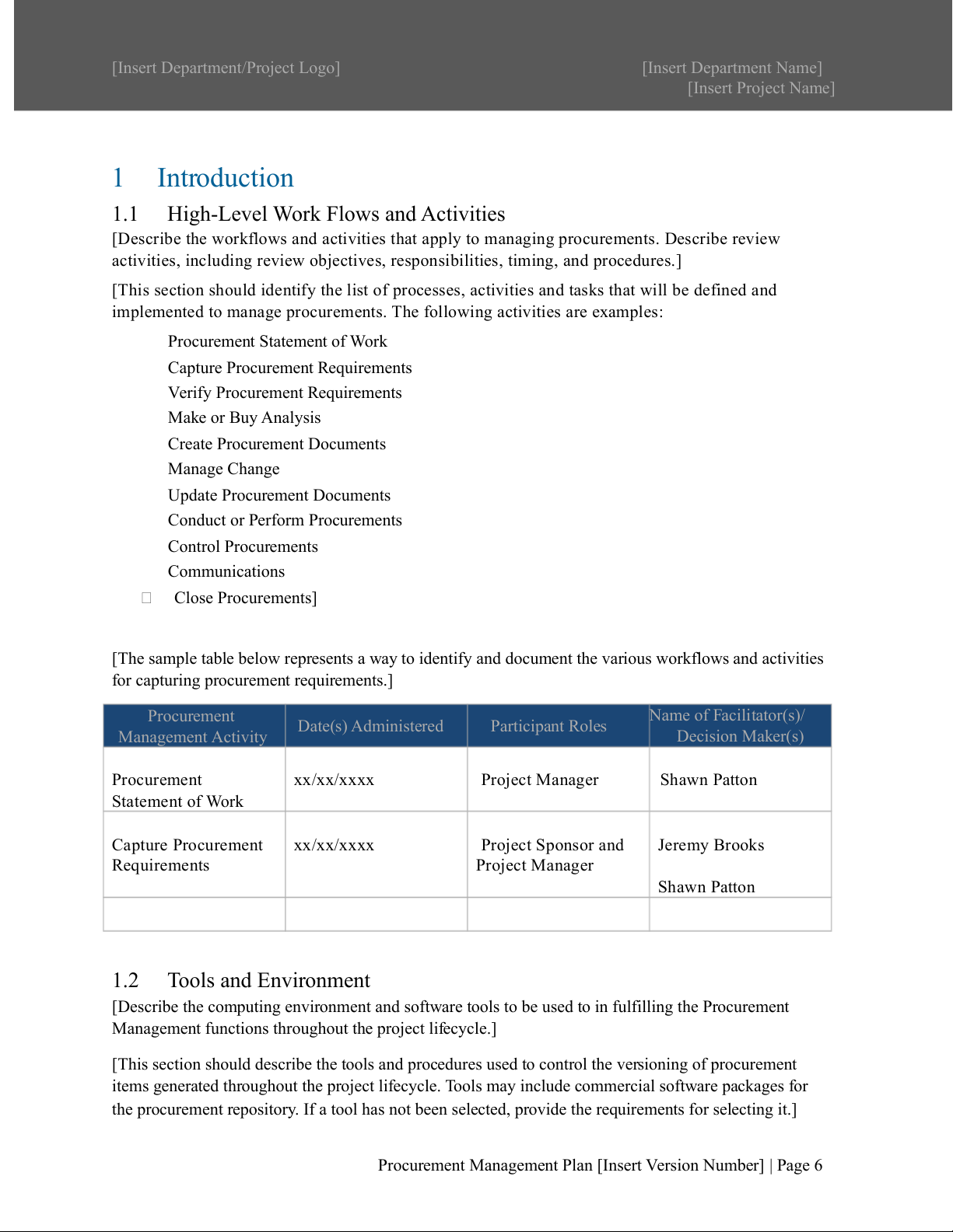 for capturing procurement requirements.] Procurement Name of Facilitator(s)/ Date(s) Administered Participant Roles Management Activity Decision Maker(s) Procurement xx/xx/xxxx Project Manager Shawn Patton Statement of Work Capture Procurement xx/xx/xxxx Project Sponsor and Jeremy Brooks Requirements Project Manager Shawn Patton 1.2 Tools and Environment