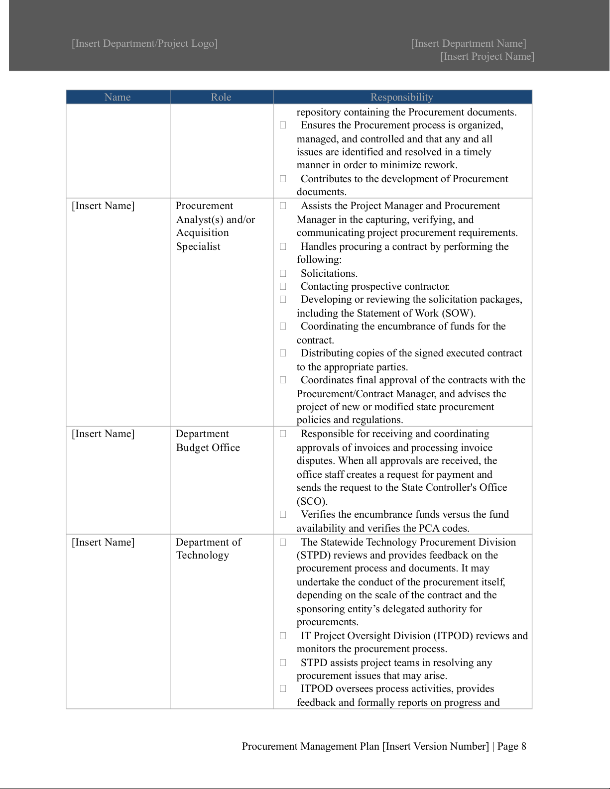 [The procurement management process must include clear roles and responsibilities for the preparation