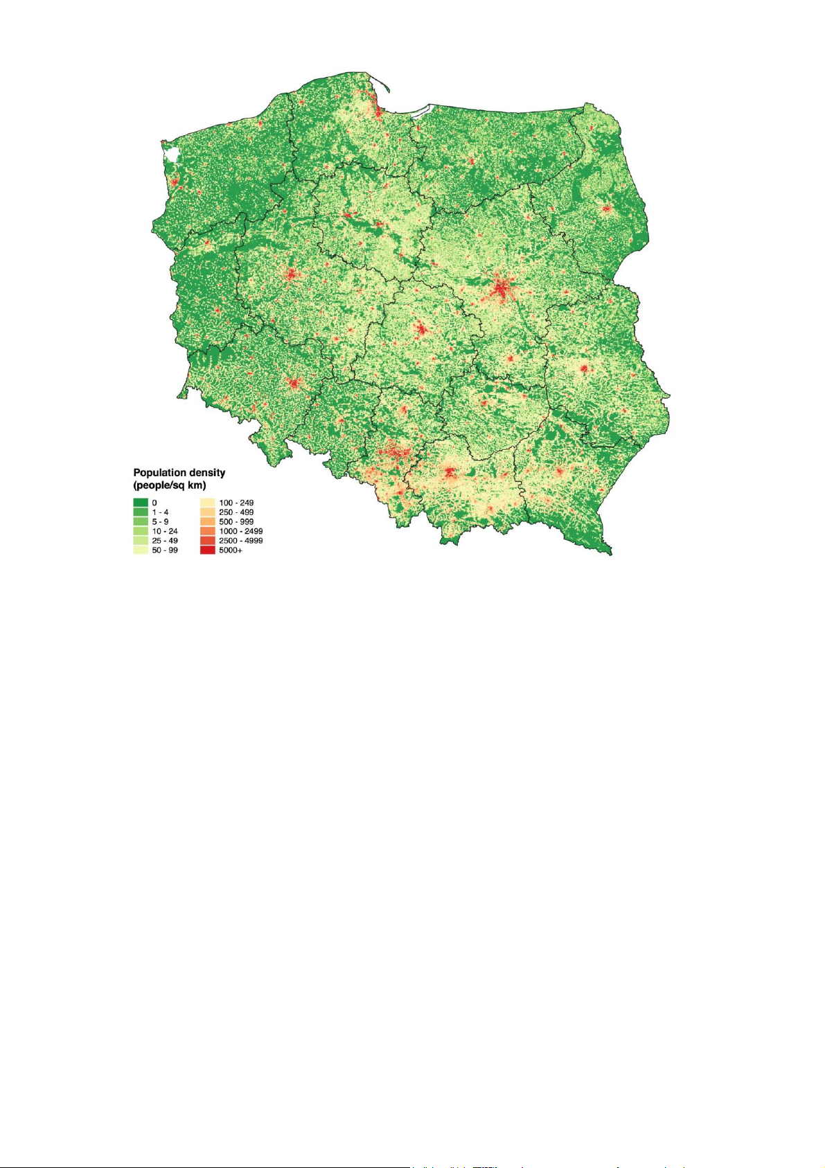 Population density chart in Poland. It can be seen that the 5 points with the largest population