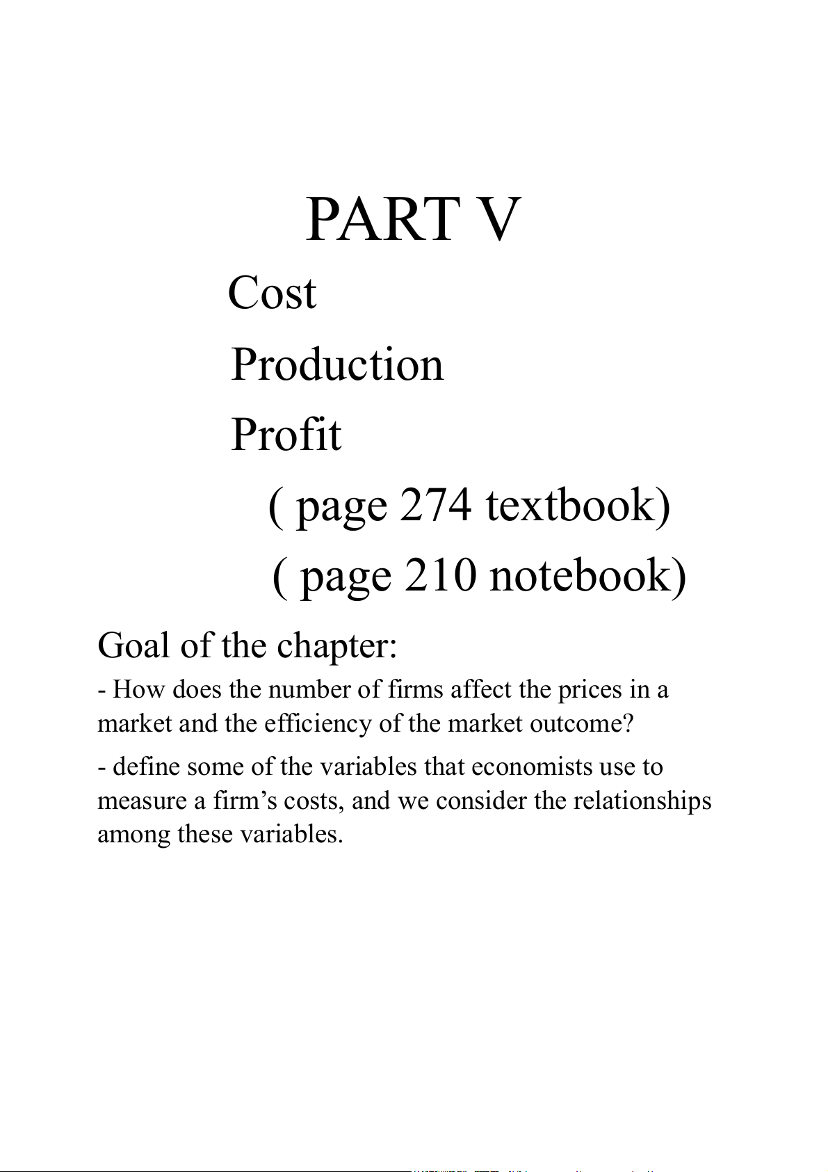 PART V Cost Production Profit ( page 274 textbook) ( page 210 notebook) Goal of the chapter: