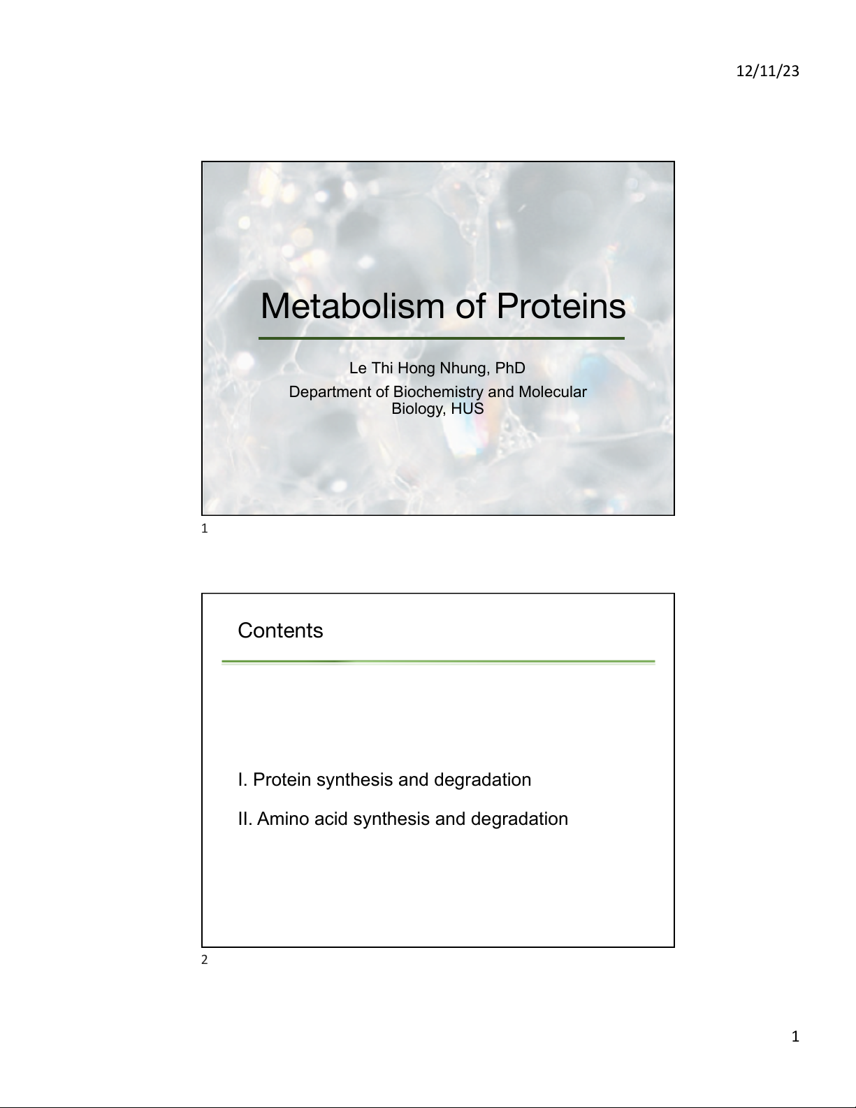 12/11/23 Metabolism of Proteins Le Thi Hong Nhung, PhD