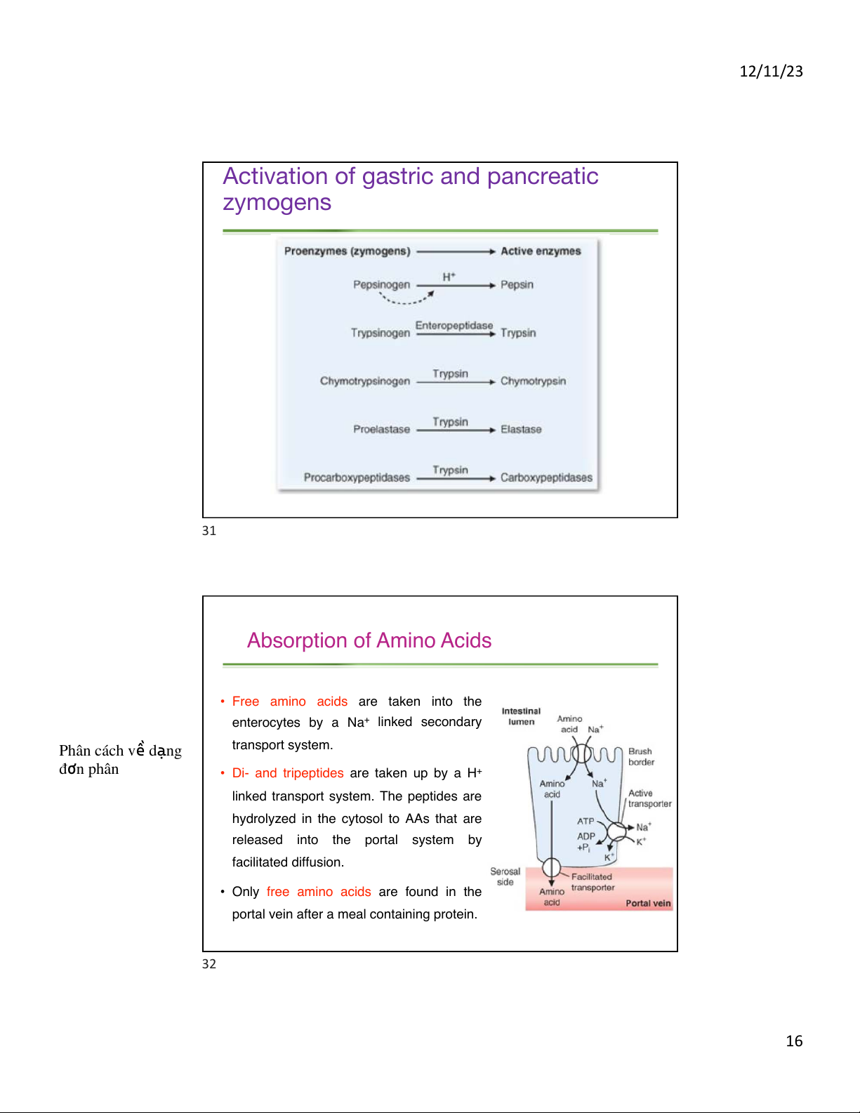Activation of gastric and pancreatic zymogens 31 Absorption of Amino Acids