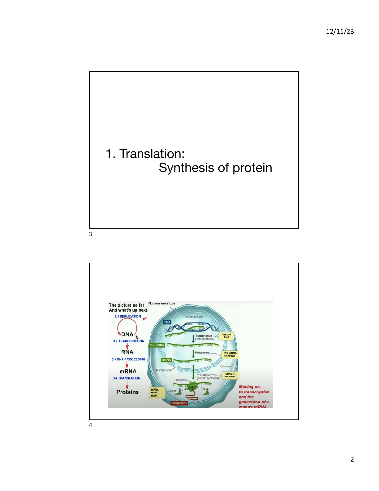 II. Amino acid synthesis and degradation 2 1 12/11/23 1. Translation: Synthesis of protein 3 4 2 12/11/23