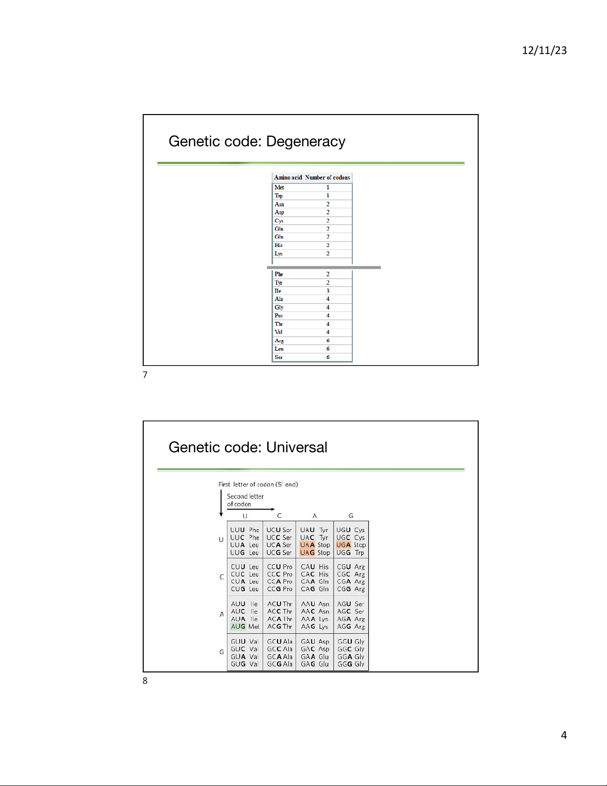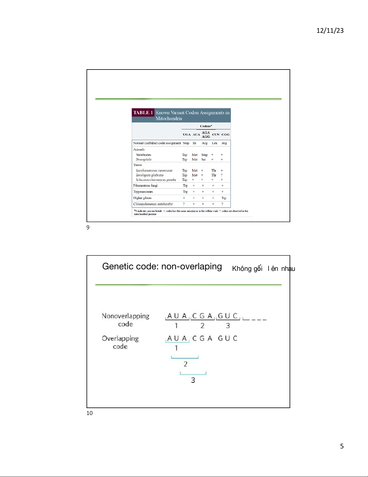 Genetic code: A codon is a triplet of nucleotides 42= 16 different combination 43= 64 different combination 5 Genetic code: Degeneracy 6 3 12/11/23 Genetic code: Degeneracy 7 Genetic code: Universal 8 4 12/11/23 9 Genetic code: non-overlaping Không gối l ên nhau 10 5 12/11/23