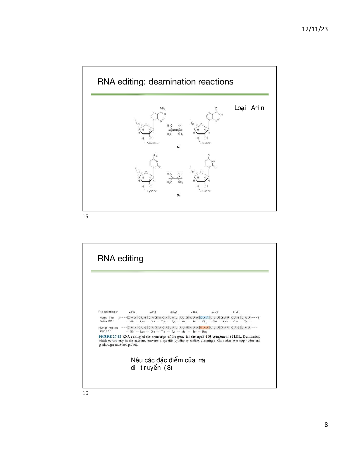 RNA editing: deamination reactions Loại Ami n 15 RNA editing Nêu các đ c ặ điểm của mã di t r uyền ( 8) 16 8 12/11/23 Summary Mã bộ 3 không đã nghÿa thoái hóa không gối l i ên t c ụ kháng đ t ộ bi n ế đọc theo chi u ề 5' - 3' 17