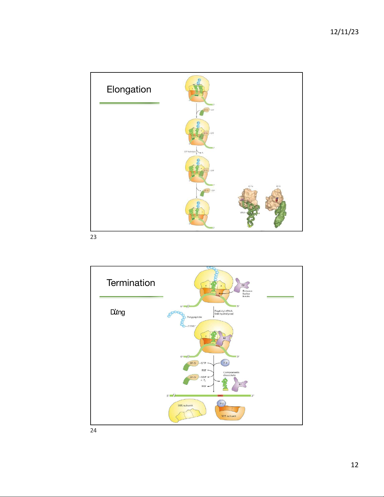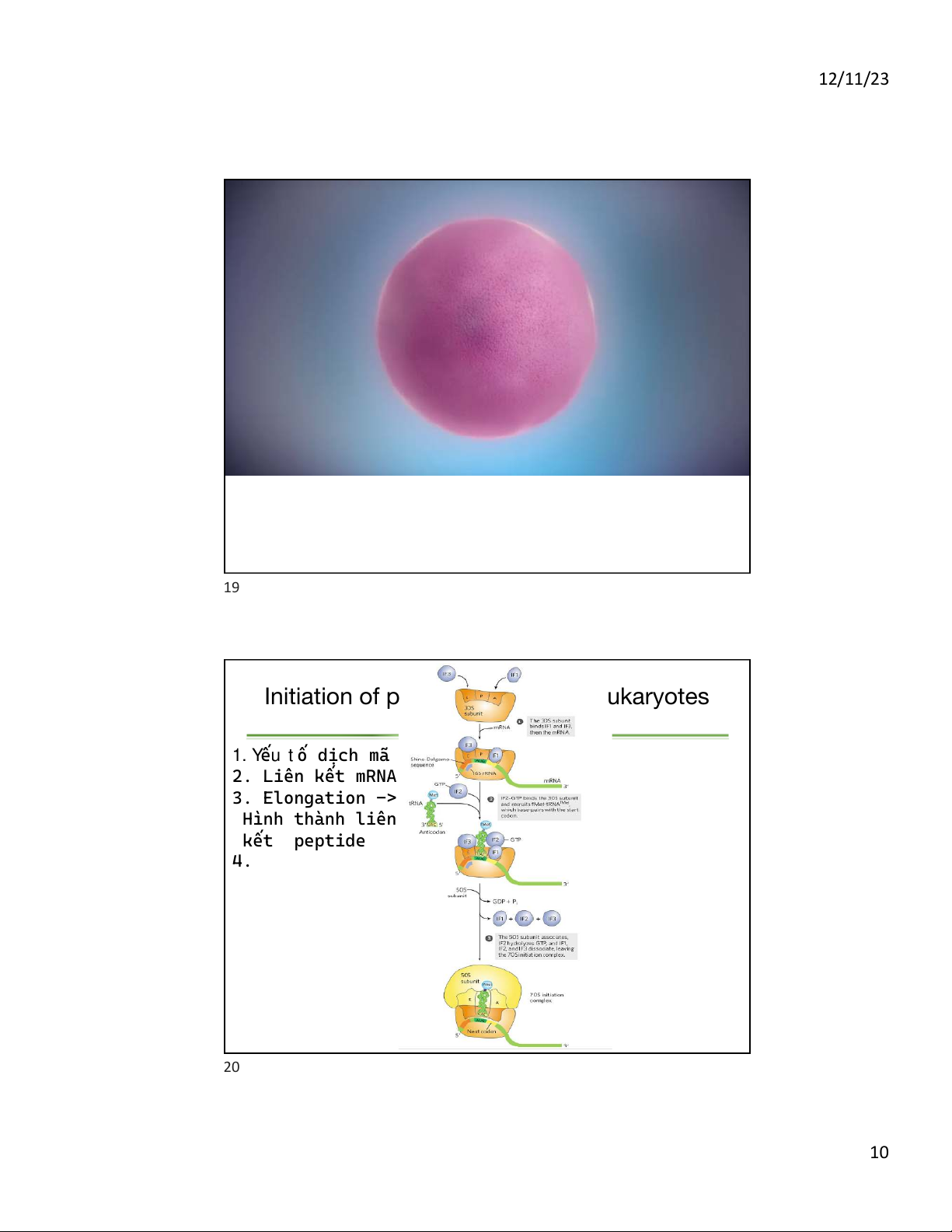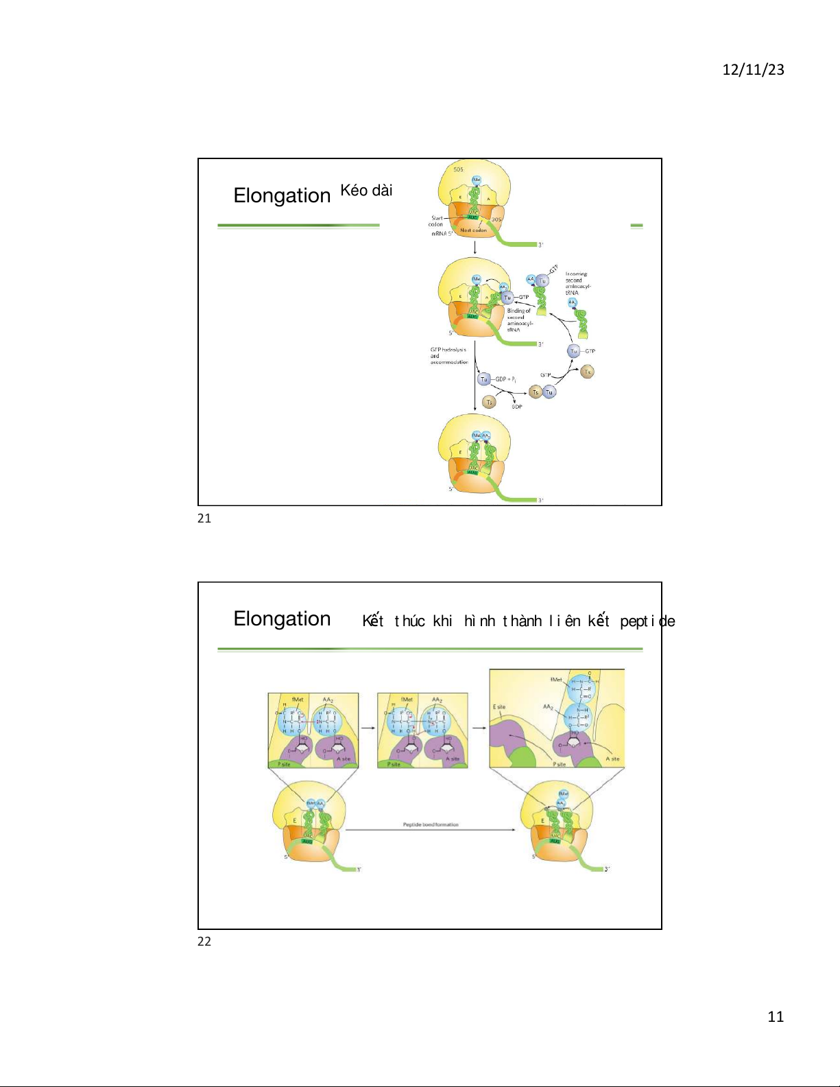 tein Biosynthesis Takes Place in Five ges 18 9 12/11/23 19 Initiation of p ukaryotes 1. Yếu t ố dịch mã 2. Liên kết mRNA 3. Elongation -> Hình thành liên kết peptide 4. 20 10 12/11/23 Elongation Kéo dài 21 Elongation